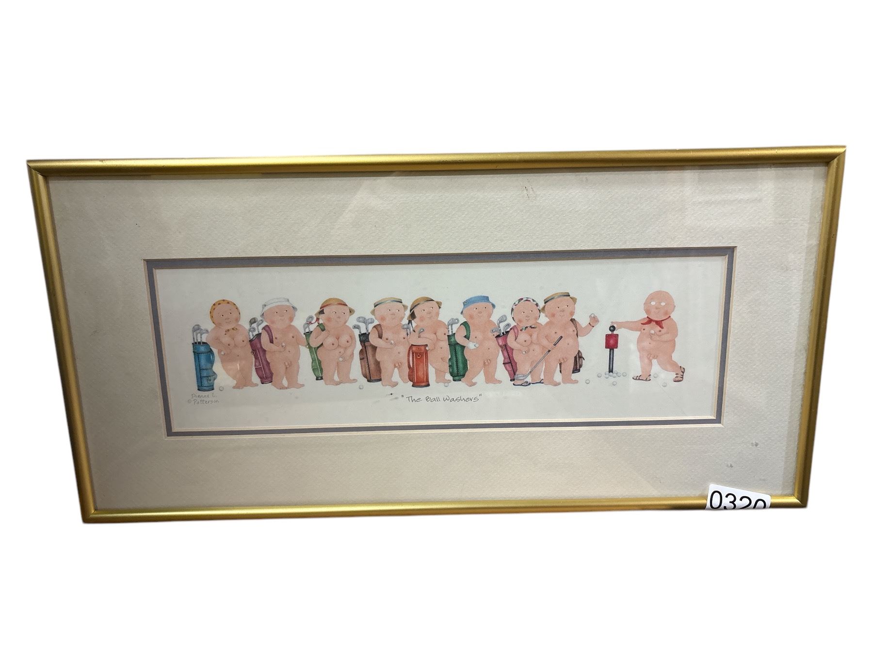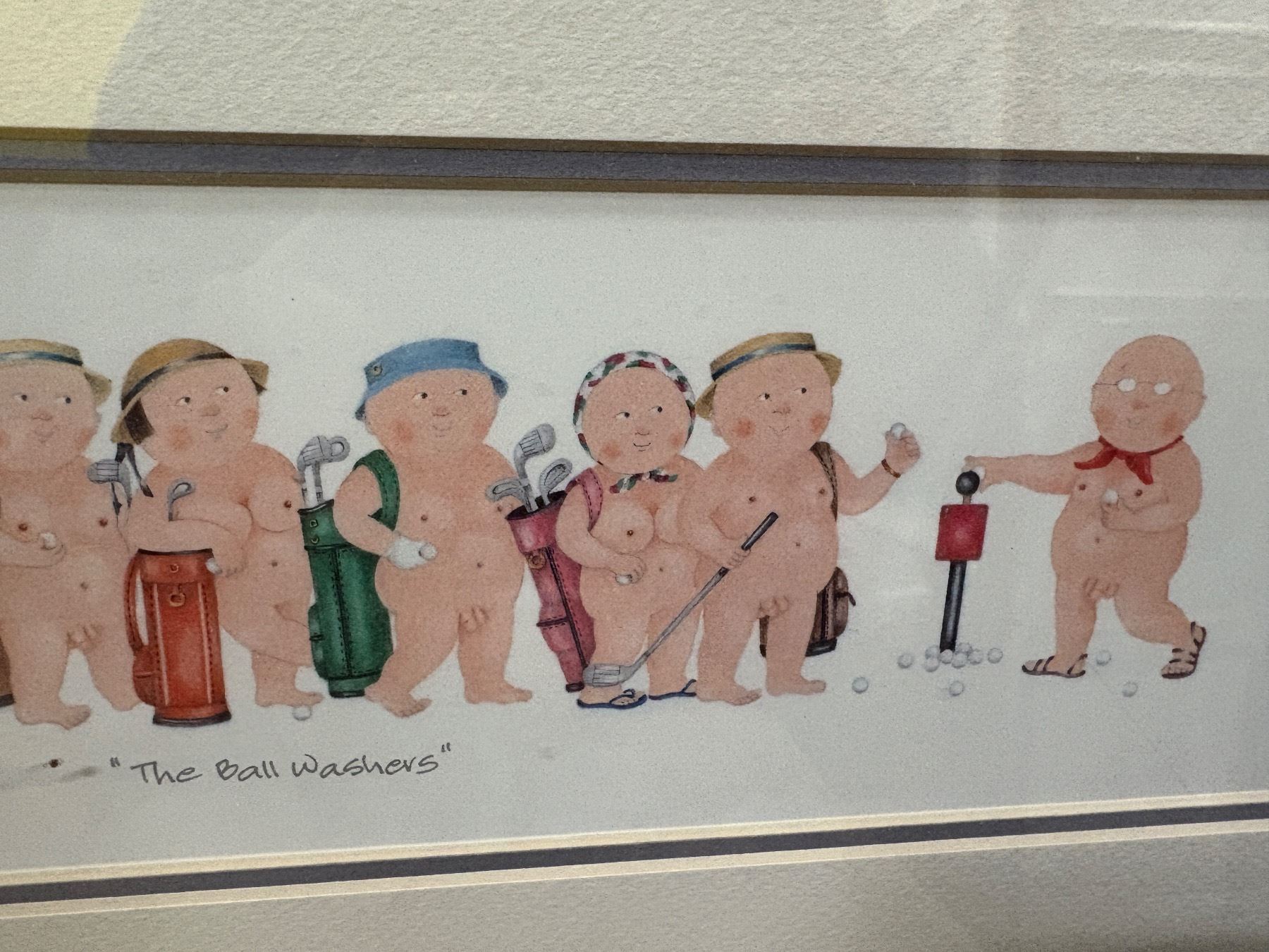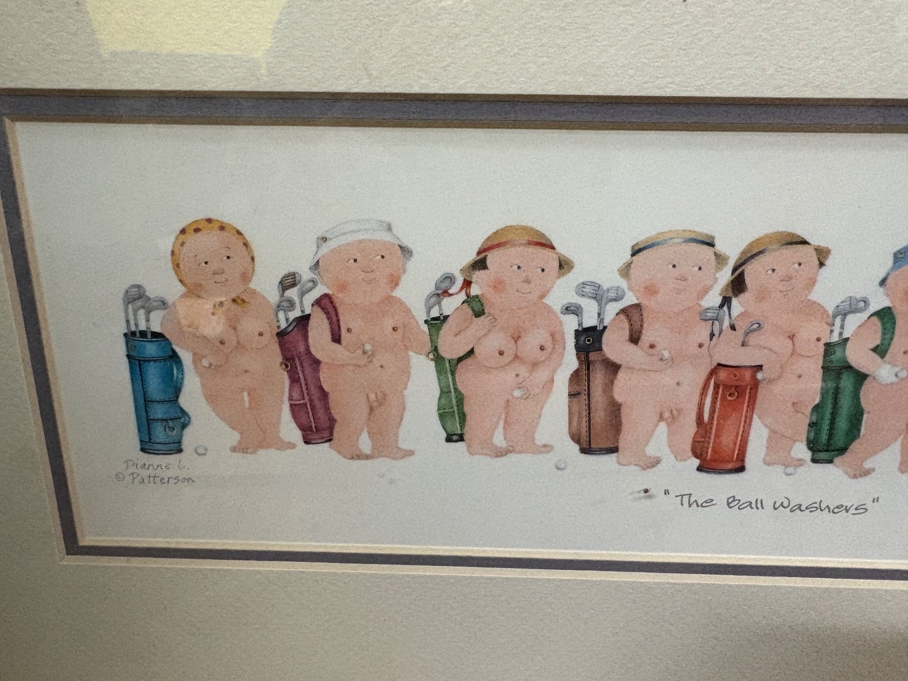 FRAMED "THE BOWL WASHERS" NUDE PRINT BY DIANNE L PATTERSON FROM ESTATE APPROX WITH ARTIST BIOGRAPHY 18.5 IN X 9 IN
