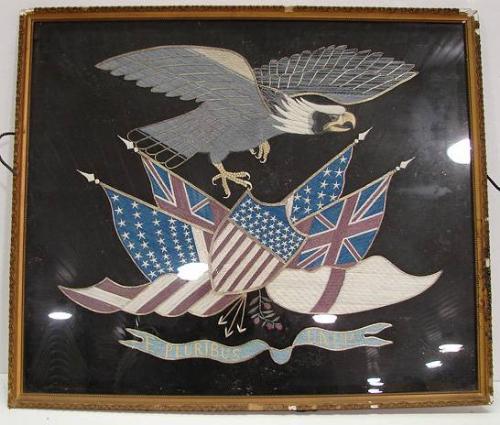 FRAMED U.S./GREAT BRITAIN MILITARY SILK. Depicts bald eagle over a United States shield and two United States flags and two Great Britain flags. Text at bottom reads “E. Pluribus Unum”. Silk rests in gilt wood frame. Frame shows areas of loss to wood. 26” x 22.25” framed