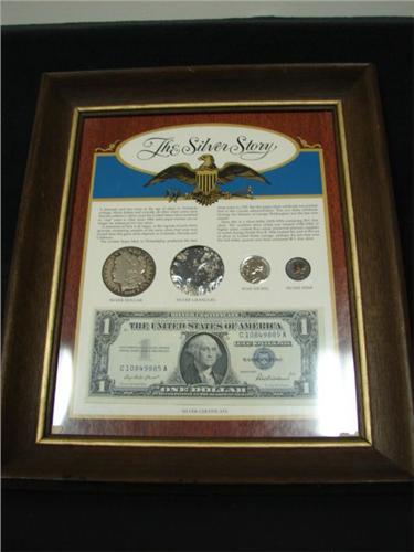 FRAMED U.S. SILVER STORY. Consists of 1890 Morgan silver dollar, silver granules, 1943 war nickel, 1923 silver dime, & 1957 silver certificate.