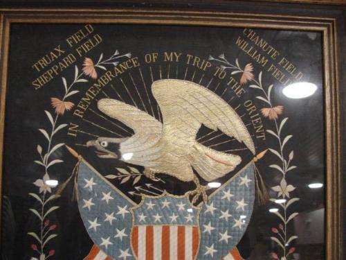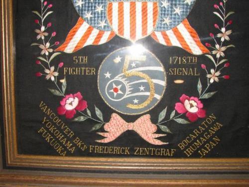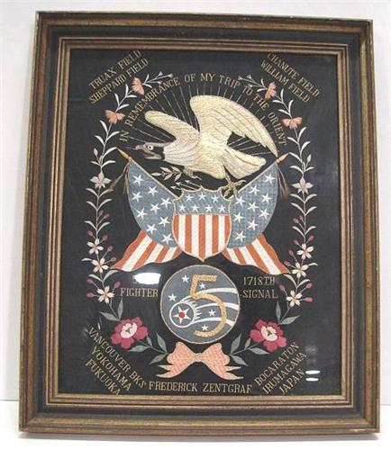 FRAMED U.S. WORLD WAR 2 MILITARY SILK. Pacific Theater. Depicts a bald eagle over a United States shield and two United States flags. Made for Frederick Zentgraf. Text reads “Truax Field/Sheppard Field/Chanute Field/William Field/5th Fighter/1718th Signal/Vancouver Bks./Yokohama/Fukuoka/Bocaraton/Irumagawa/Japan. Text at top of eagle reads “In Rememberance Of My Trip To The Orient”. Silk rests in giltwood frame. 19.25” x 23.25” framed