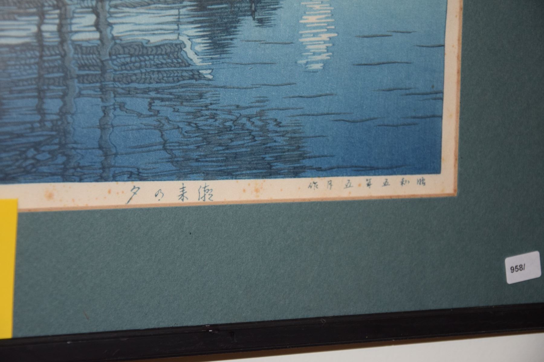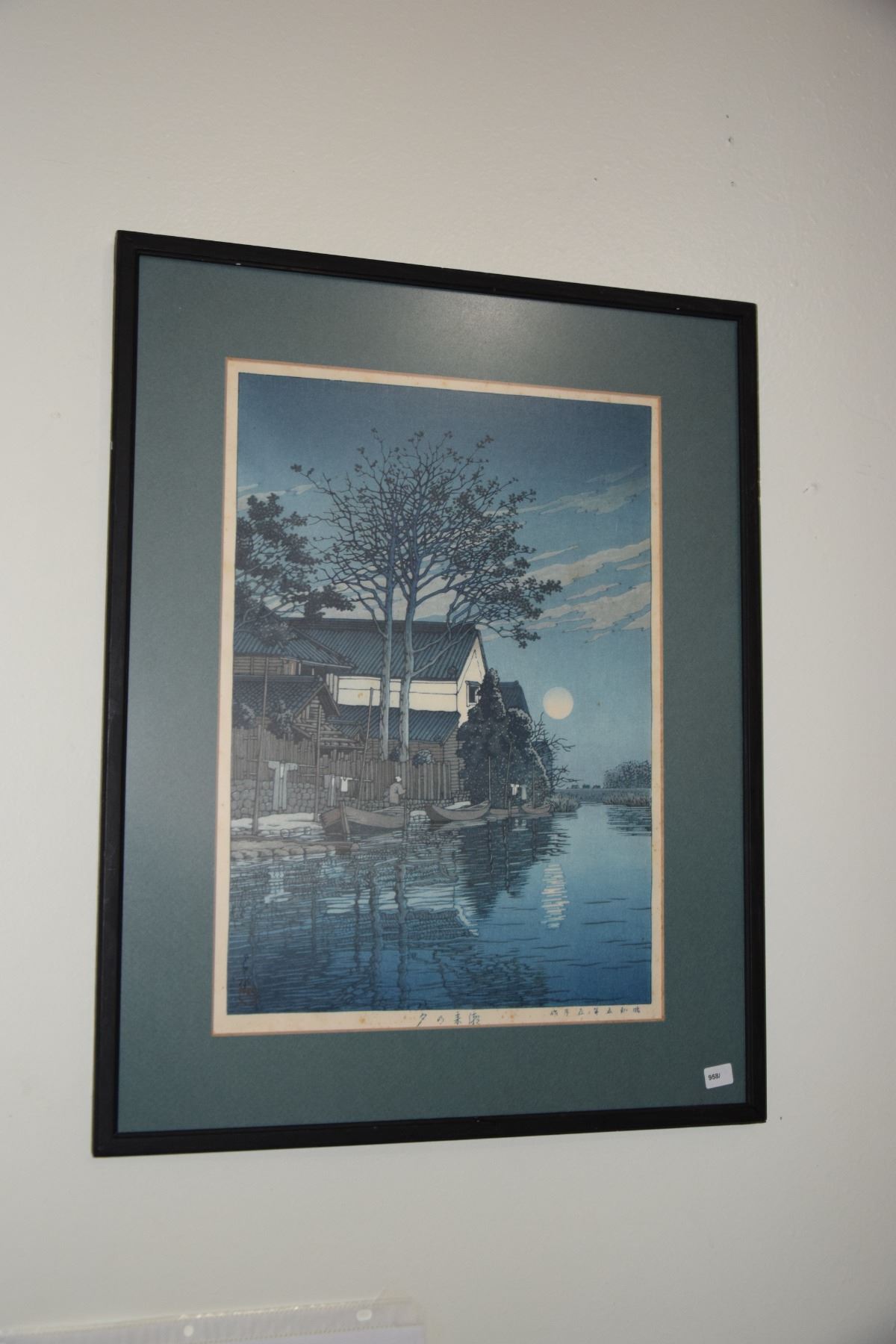 FRAMED UKIOUE WOODBLOCK PRINT, "MOONLIGHT REFLECTIONS ON RIVER"; SIGNED
