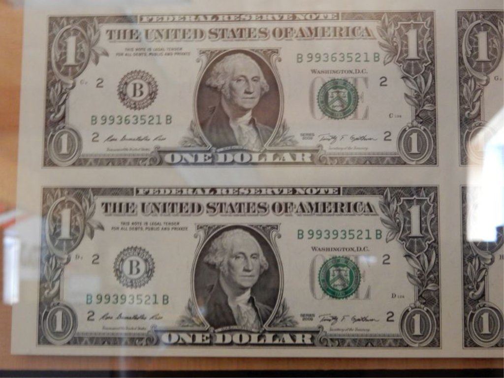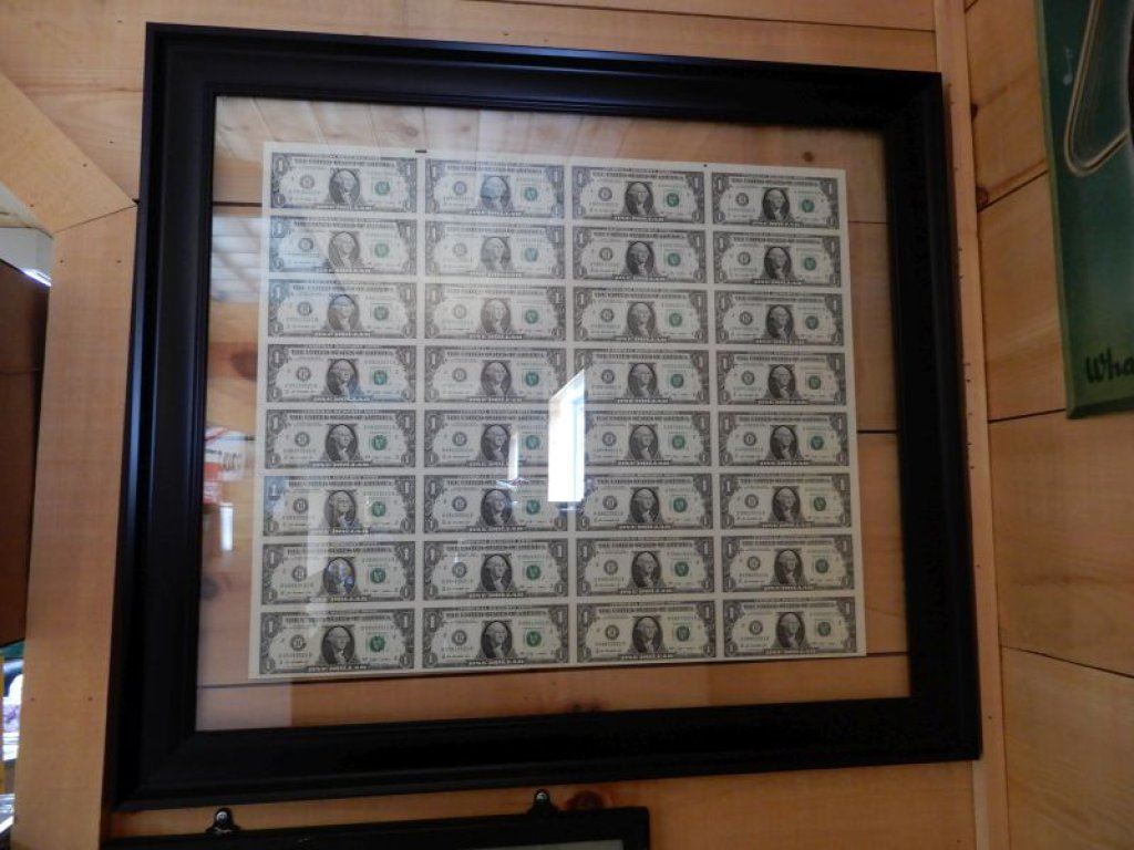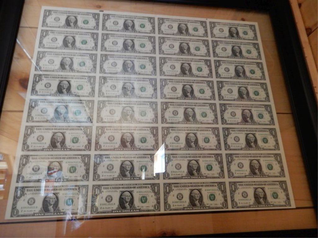 FRAMED UNCUT SHEET OF 32 U.S.A. ONE DOLLAR BILLS 2009 SERIES - 34" X 30" LOCATION: UPPER BACKROOM