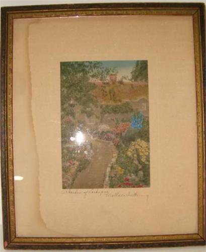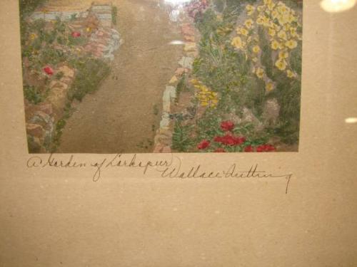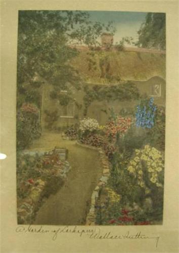FRAMED WALLACE NUTTING EXTERIOR PRINT. Depicts a garden outside a cottage. Signed in lower left "A Garden of Larspur" and signed in lower right "Wallace Nutting". Shows water damage to matting at left side. 11" x 13" framed.