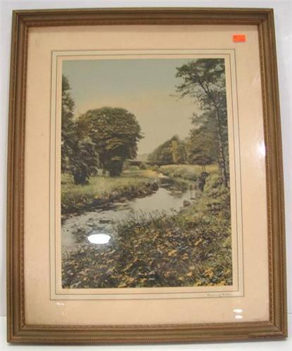 FRAMED WALLACE NUTTING EXTERIOR PRINT. Depicts a stream running through a meadow. Signed in lower right “Bonny Dale”. Rests in wooden frame. Marked on verso with Wallace Nutting label. 17.5” x 21.75” framed