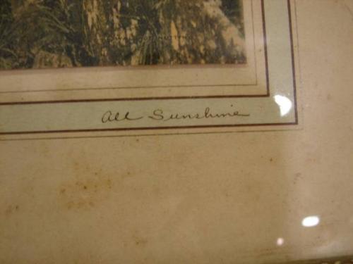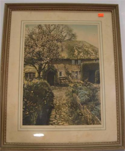 FRAMED WALLACE NUTTING EXTERIOR PRINT. Depicts an exterior view of a brick cottage and path. Signed in lower right. “All Sunshine”. Rests in wooden frame. Marked on verso with Wallace Nutting label. 17.5” x 21.75” framed.