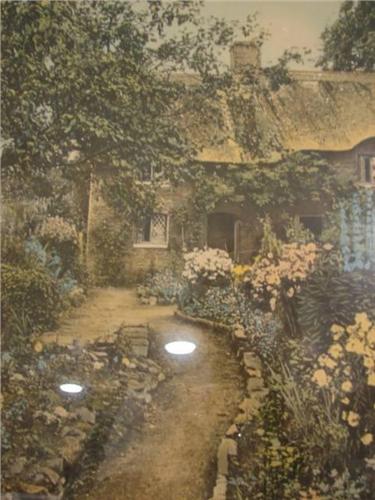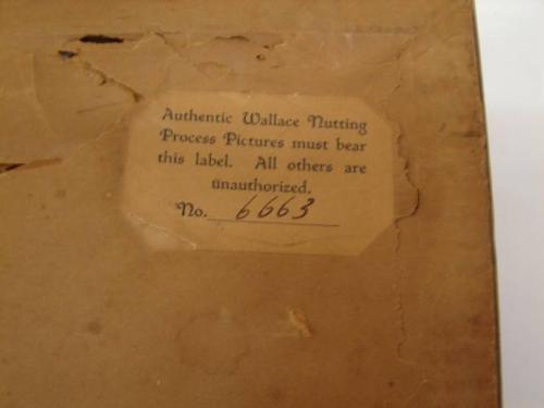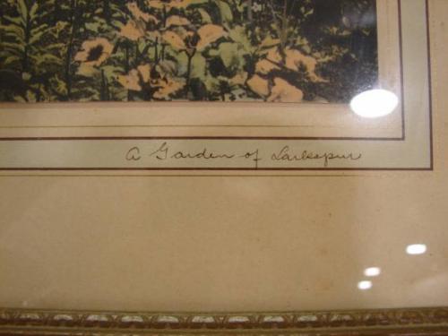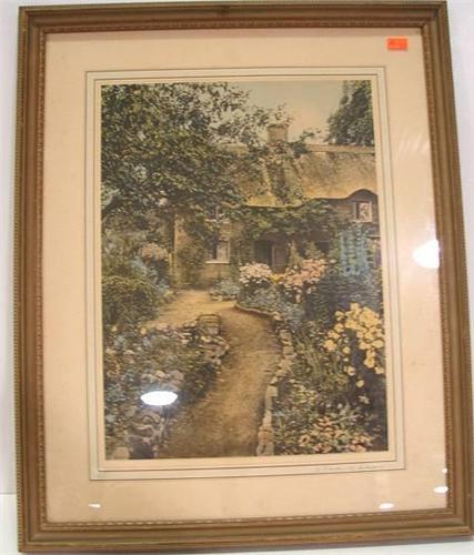 FRAMED WALLACE NUTTING EXTERIOR PRINT. Depicts an exterior view of a brick cottage and path through a garden. Signed in lower right “A Garden of Larkspur”. Rests in wooden frame. Marked on verso with Wallace Nutting label. 17.5” x 21.75” framed.