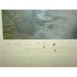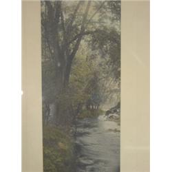 FRAMED WALLACE NUTTING PRINT. Exterior scene of creek in forest. Signed in lower right and titled in lower left “Westfield Water”. Shows signs of water damage to lower right of matte. 10.5” x 16.75” framed.
