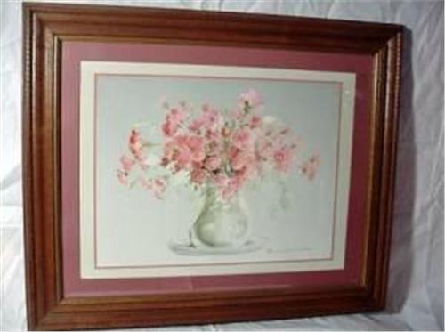 FRAMED WATERCOLOR BY ARTIST ROSALIND OESTERLE OF A VASE OF FLOWERS. 19"X23".