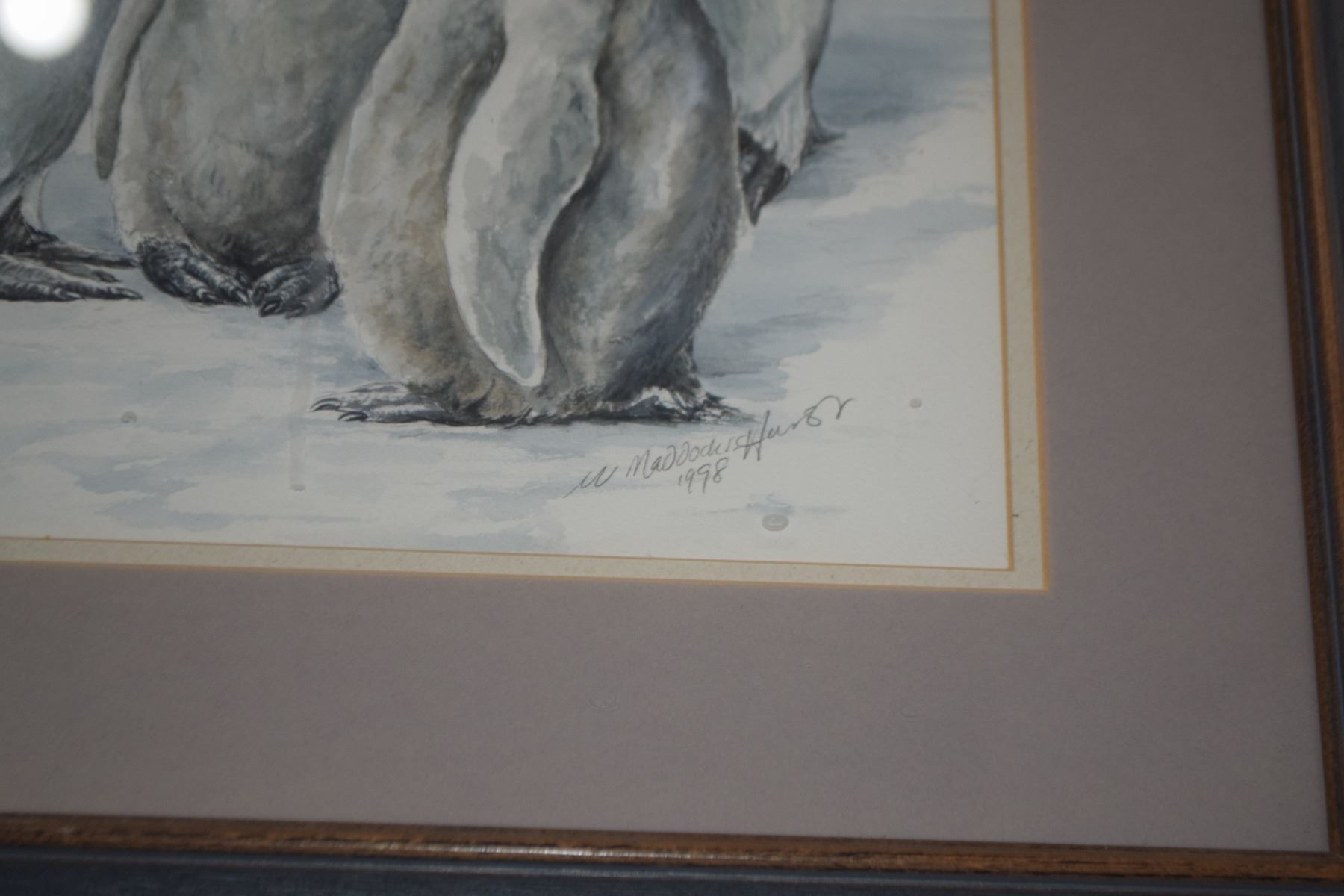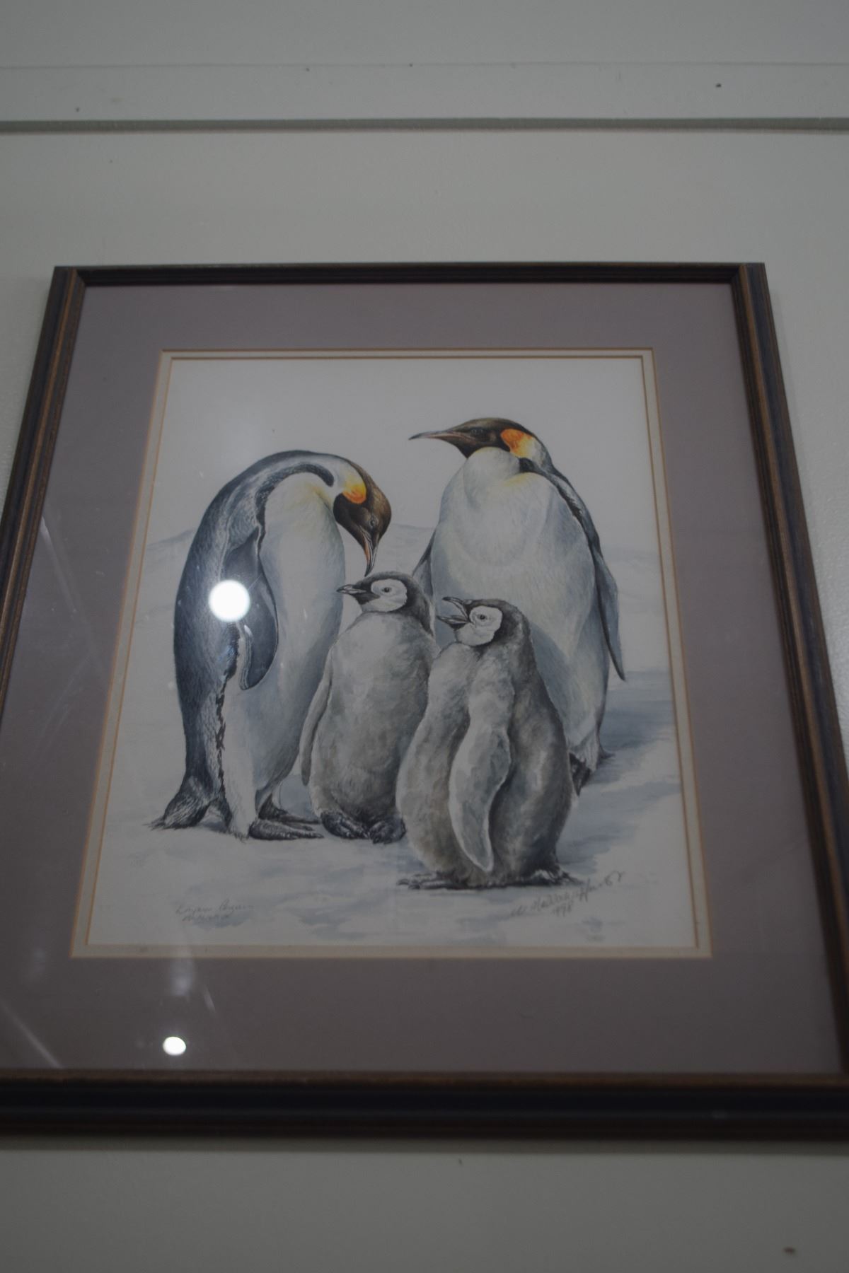 FRAMED WATERCOLOR, "EMPEROR PENGUINS"; SIGNED (20 1/4" X 23 2/4")