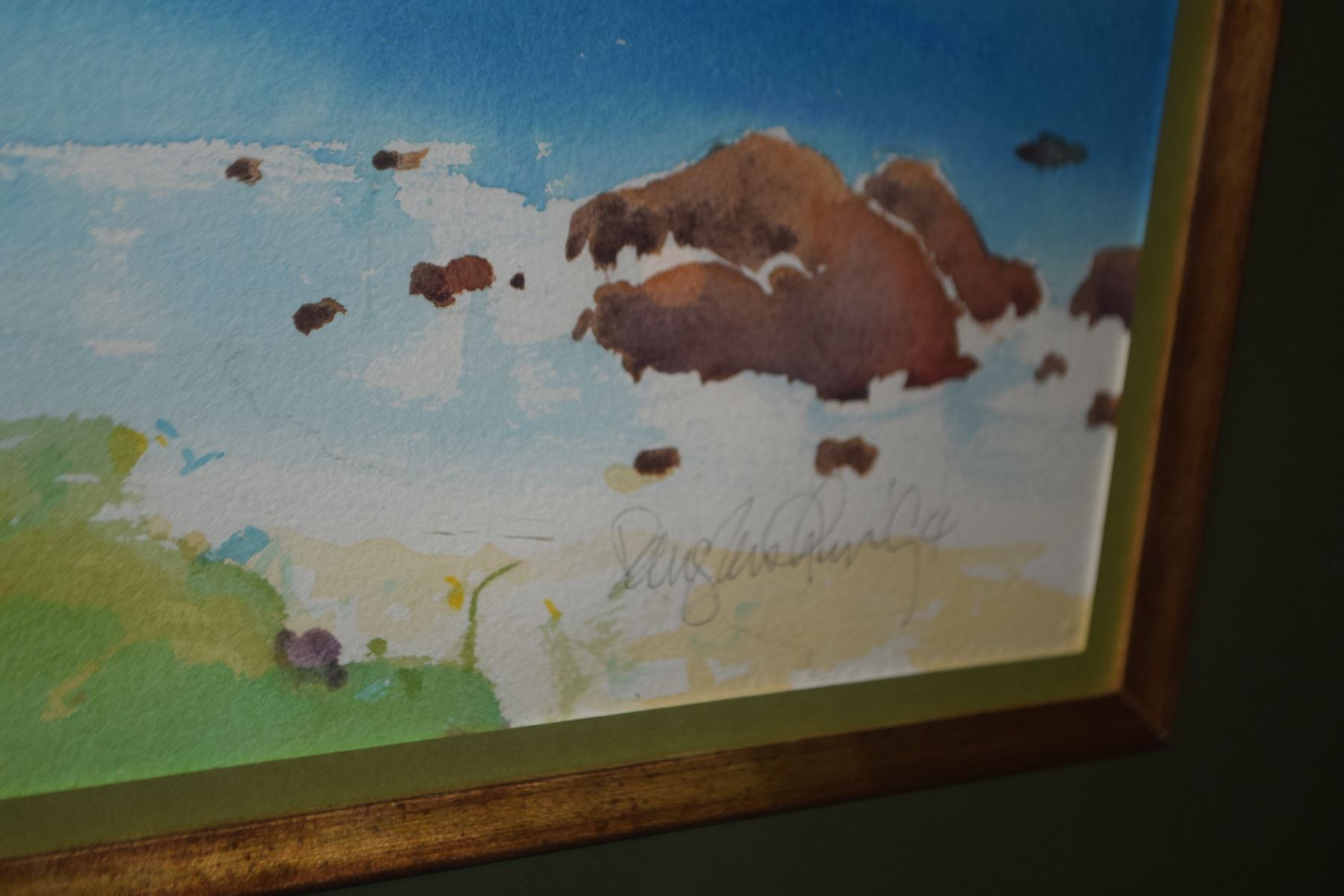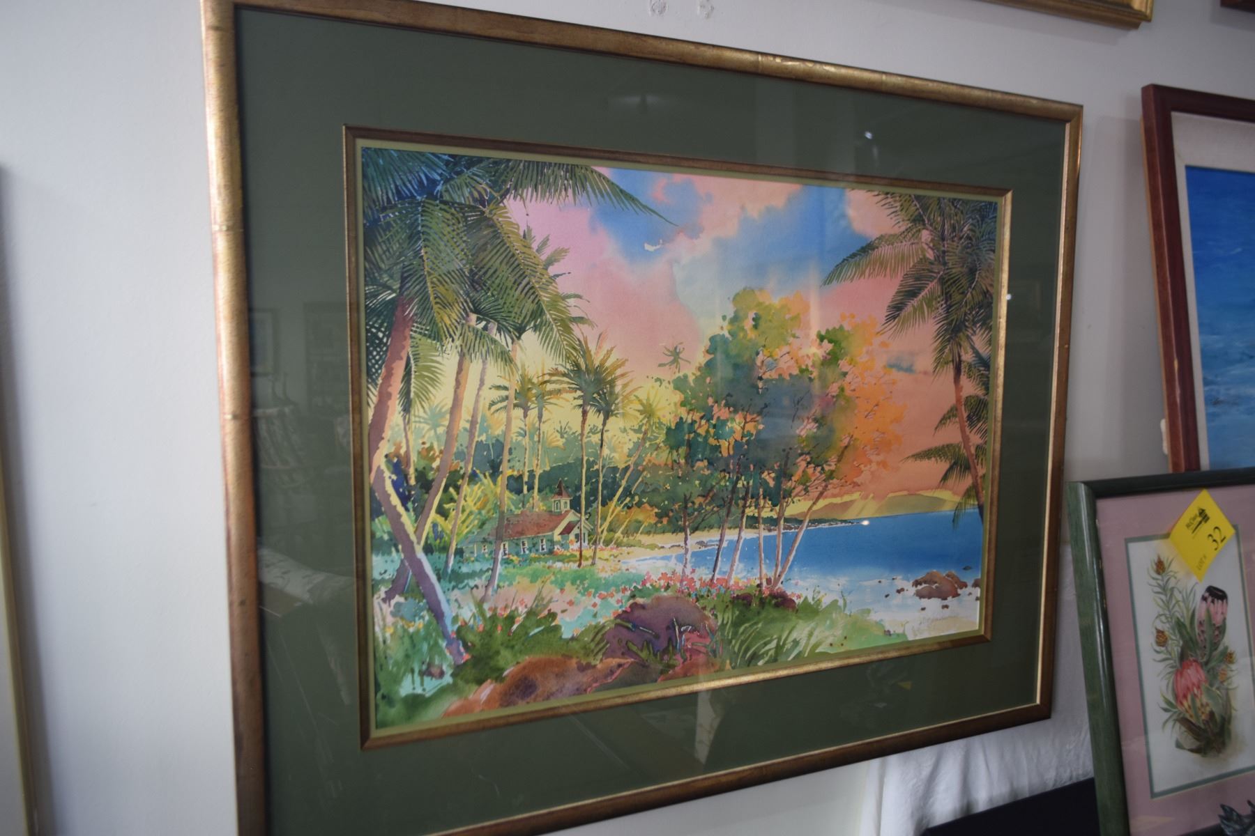 FRAMED WATERCOLOR ON PAPER, "PARADISE FOUND", DEPICTING A COLORFUL HAWAIIAN LANDSCAPE SCENE W/A WOODEN CHURCH ON THE COAST SURROUNDED BY A LUSH TROPICAL FOLIAGE; SIGNED & DATED DOUGLAS CHUN '94 (38 1/2" X 30 3/4")