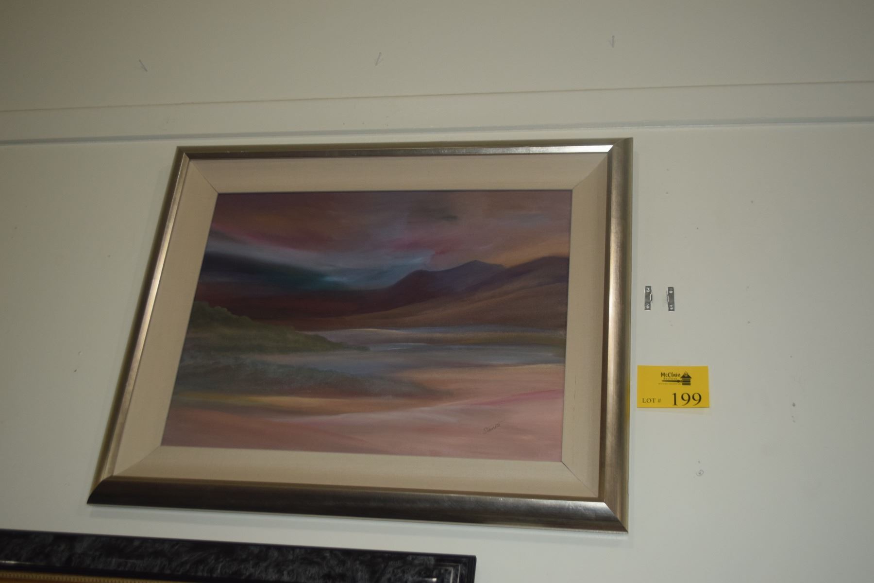 FRAMED WATERCOLOR ON PAPER, "SILKEN SKIES", DEPICTING A SWEEPING VIEW OF A MOUNTAIN, VALLEY & SKY TI