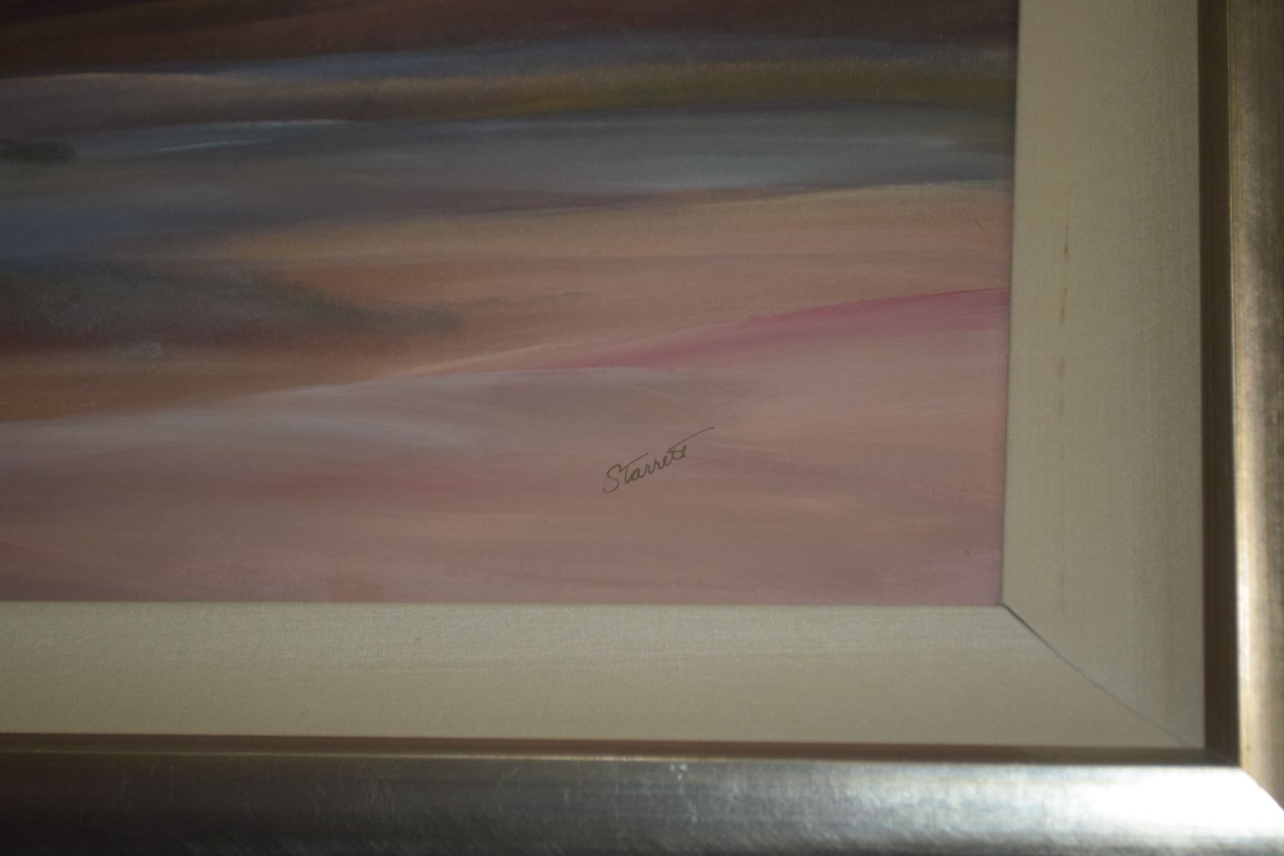 FRAMED WATERCOLOR ON PAPER, "SILKEN SKIES", DEPICTING A SWEEPING VIEW OF A MOUNTAIN, VALLEY & SKY TINGED IN SHADES OF MAUVE, PURPLE, BLUE & PINK; SIGNED STARRETT (31" X 25")