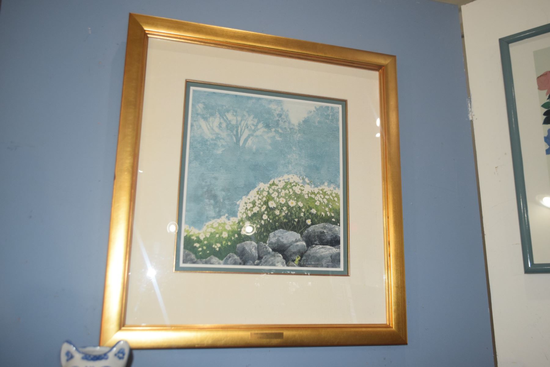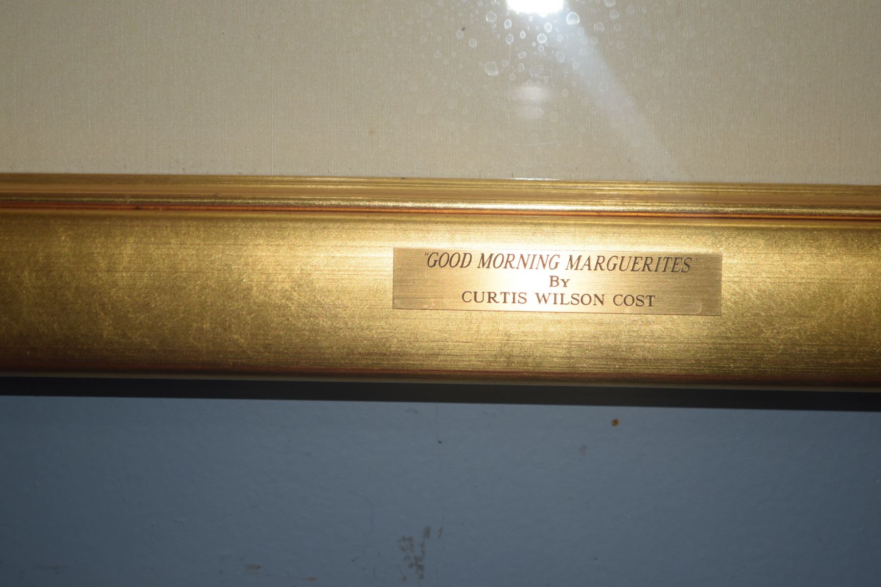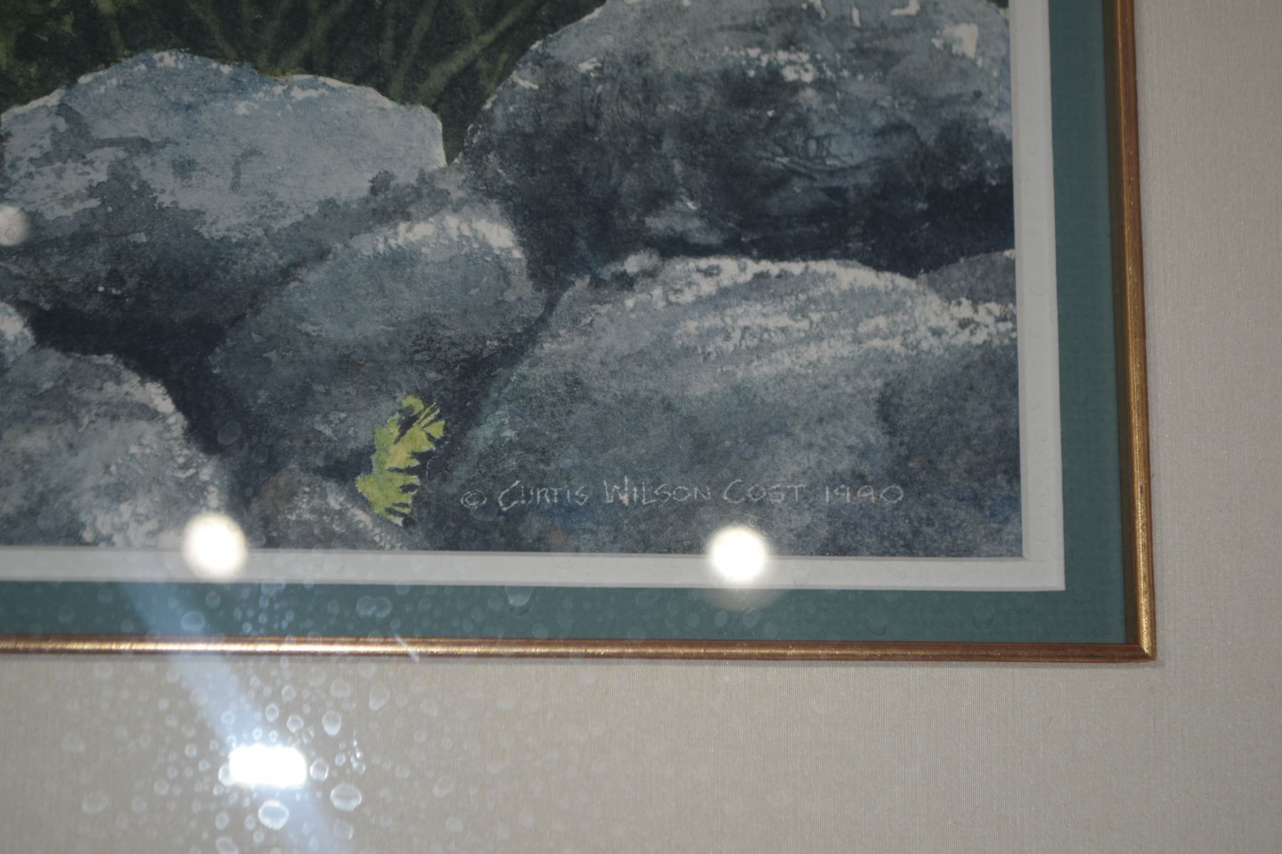 FRAMED WATERCOLOR ON PAPER, UNTITLED, DEPICTING BLOSSOMING WHITE DAISIES W/MISTY TREES IN THE BACKGROUND; SIGNED CURTIS WILSON CAST (27" X 29 1/2")