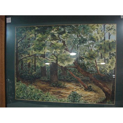 FRAMED WATERCOLOR PAINTING. Oil on canvas. Depicts a forest scene. Framed and matted. No signature visible. Not examined out of frame. 14” x 19” sight.