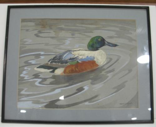 FRAMED WATERFOWL WATERCOLOR PAINTING. Depicts a shoveler (spoon bill) drake in water. Signed in lower right “Ralston Gudgeon”. 25” x 20” framed.