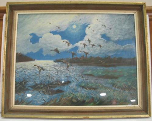 FRAMED WATERFOWL WATERCOLOR PAINTING. Depicts a group of ducks in flight. Signed in lower right “Ralston Gudgeon”. Signed on back “Widgeon & Pintails, 1950”. 27.5” x 22.5” framed.