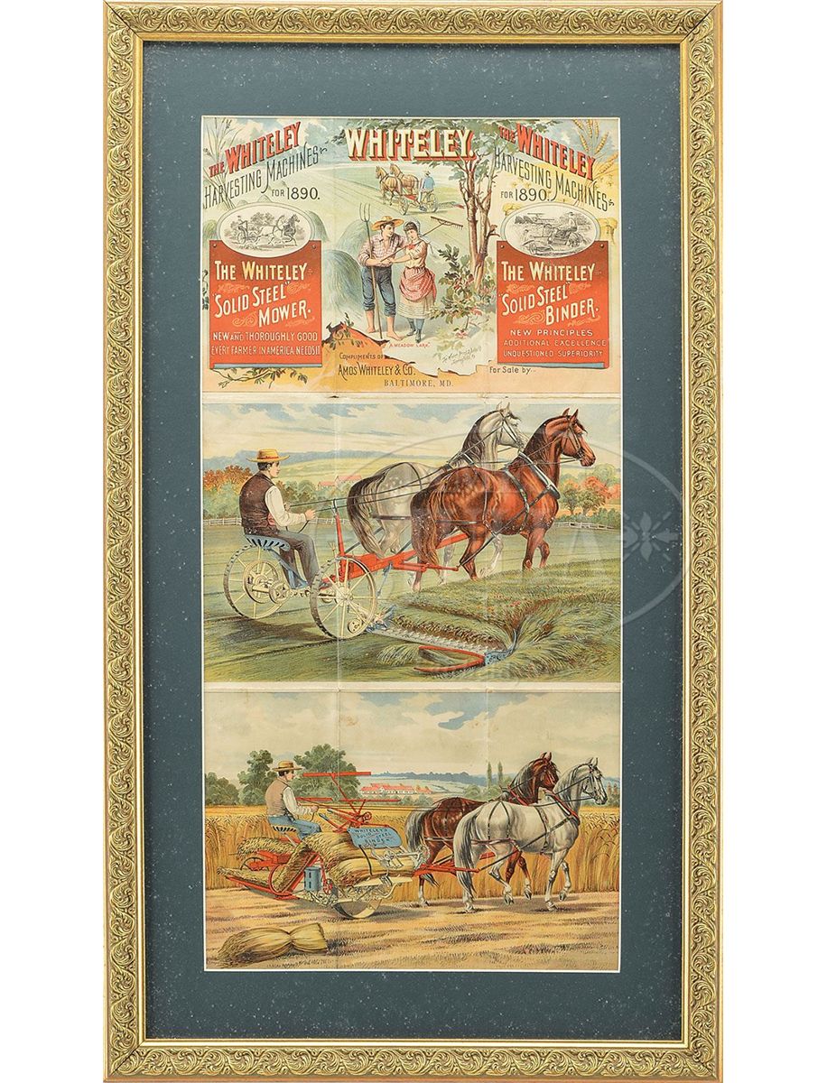 Lithographed brochure unfolded to display colorful panels of their farm machinery at work in the field. SIZE: Sight size: 12-3/4" w x 26-3/4" t. CONDITION: Good to very good; exhibits brochure folds and light soiling. 1-13263