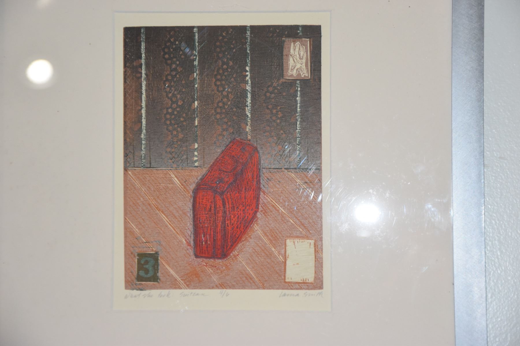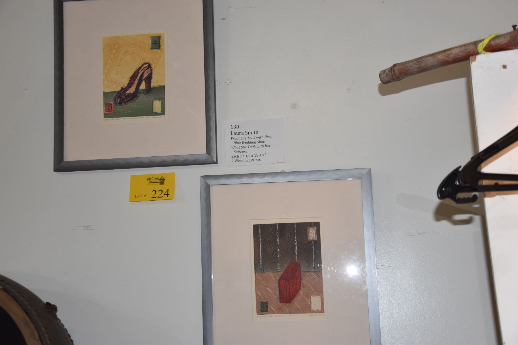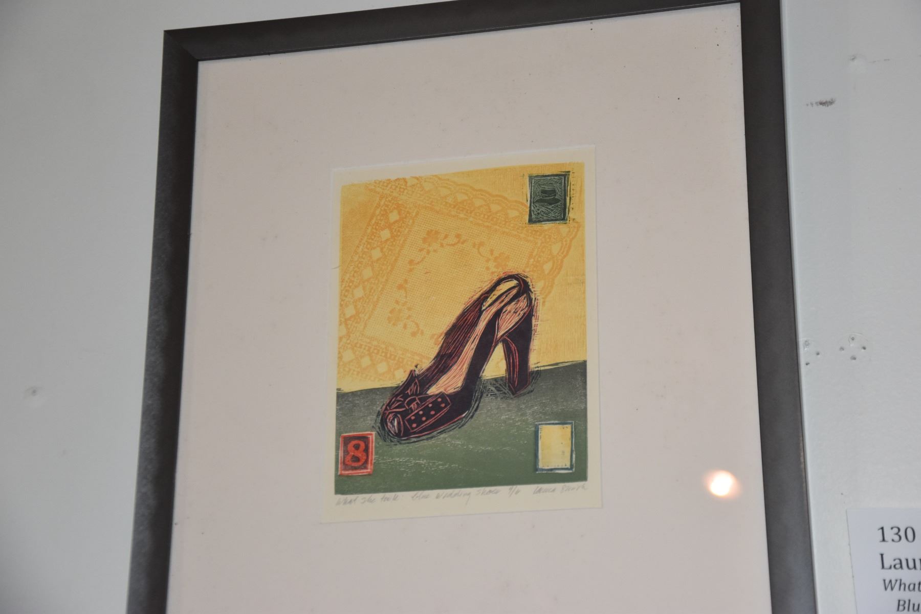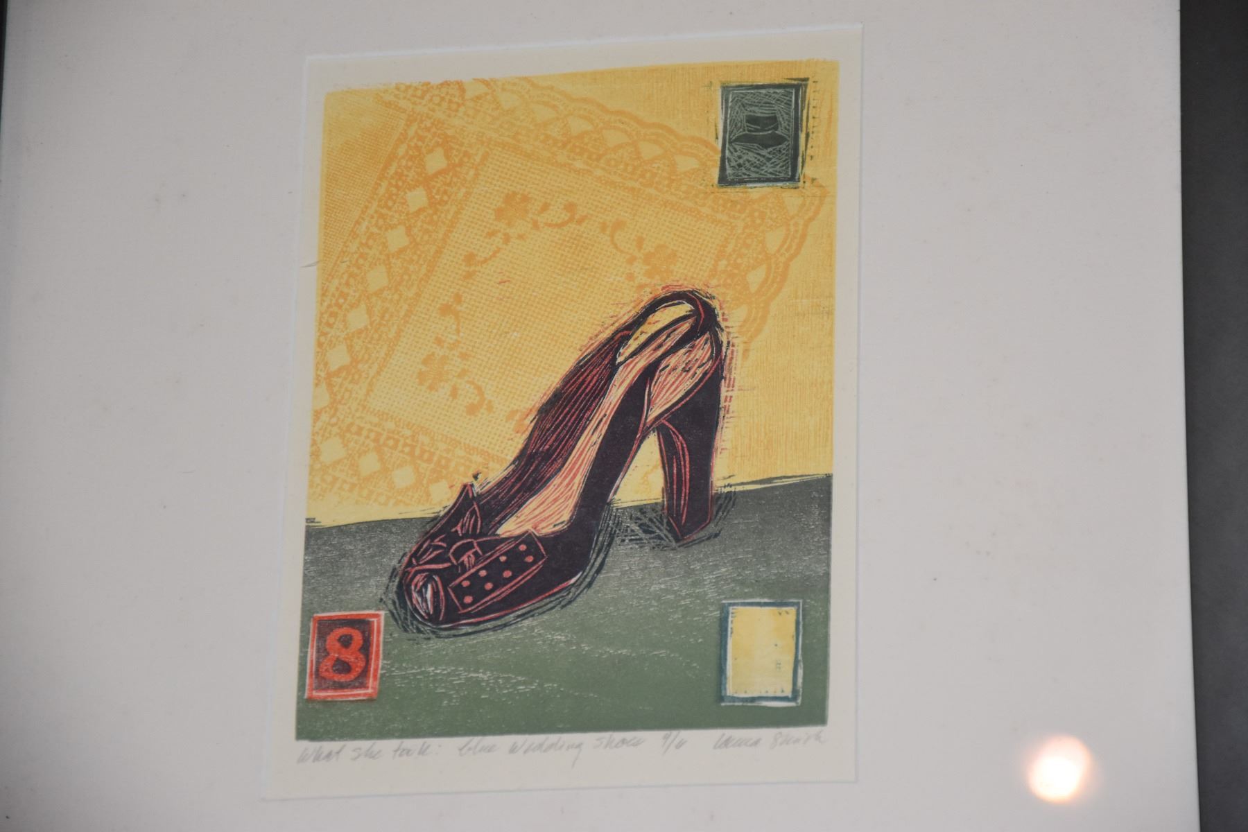 FRAMED WOODCUT PRINTS: WHAT SHE TOOK WITH HER, BLUE WEDDING SHOE & SUITCASE BY LAURA SMITH (15 1/2" X 17 1/2") (2 PCS)