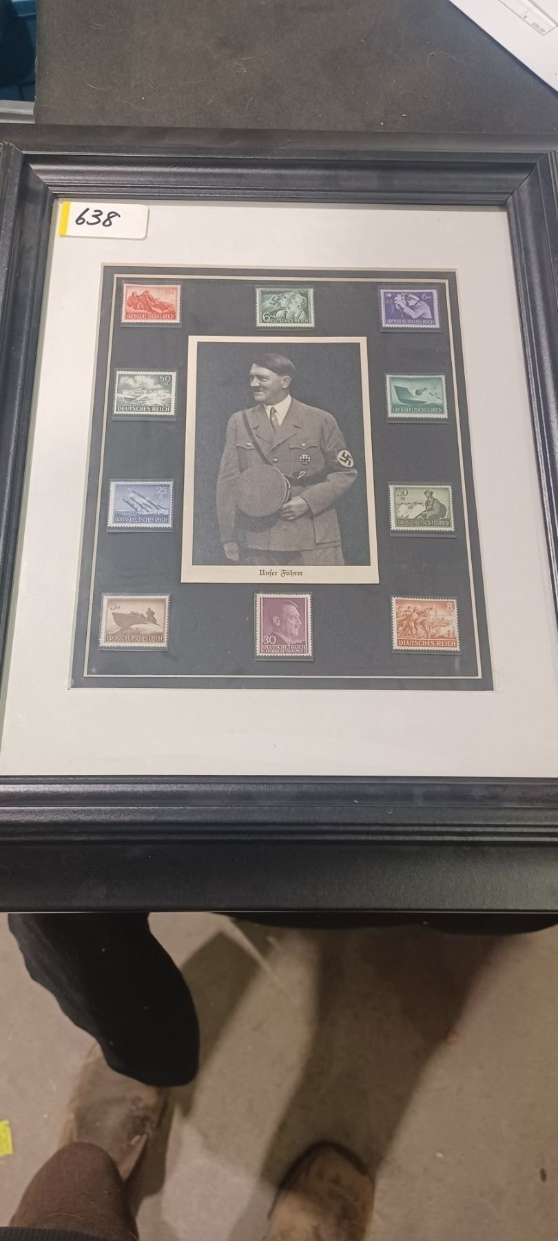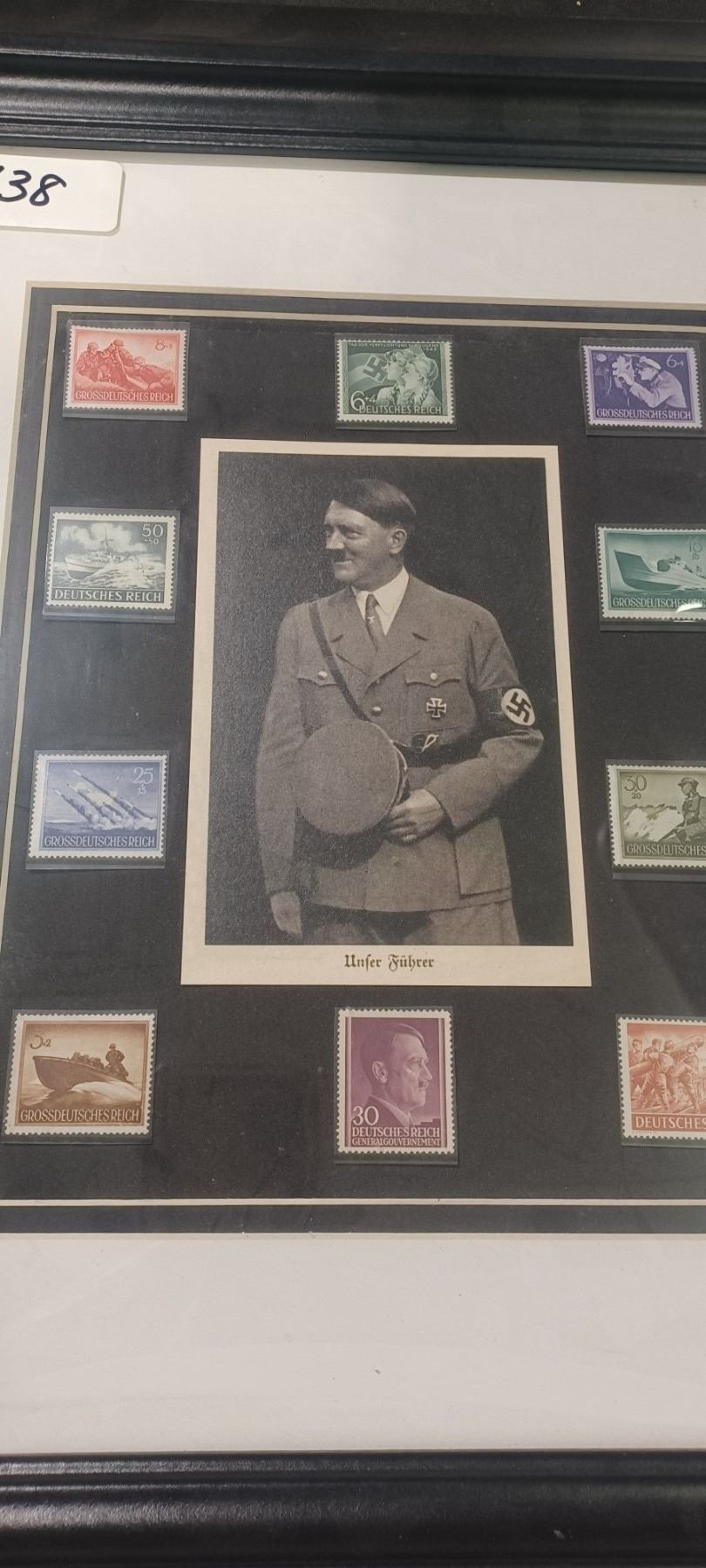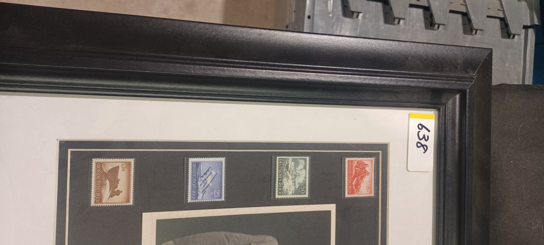 FRAMED WW II HITLER PHOTO AND STAMPS