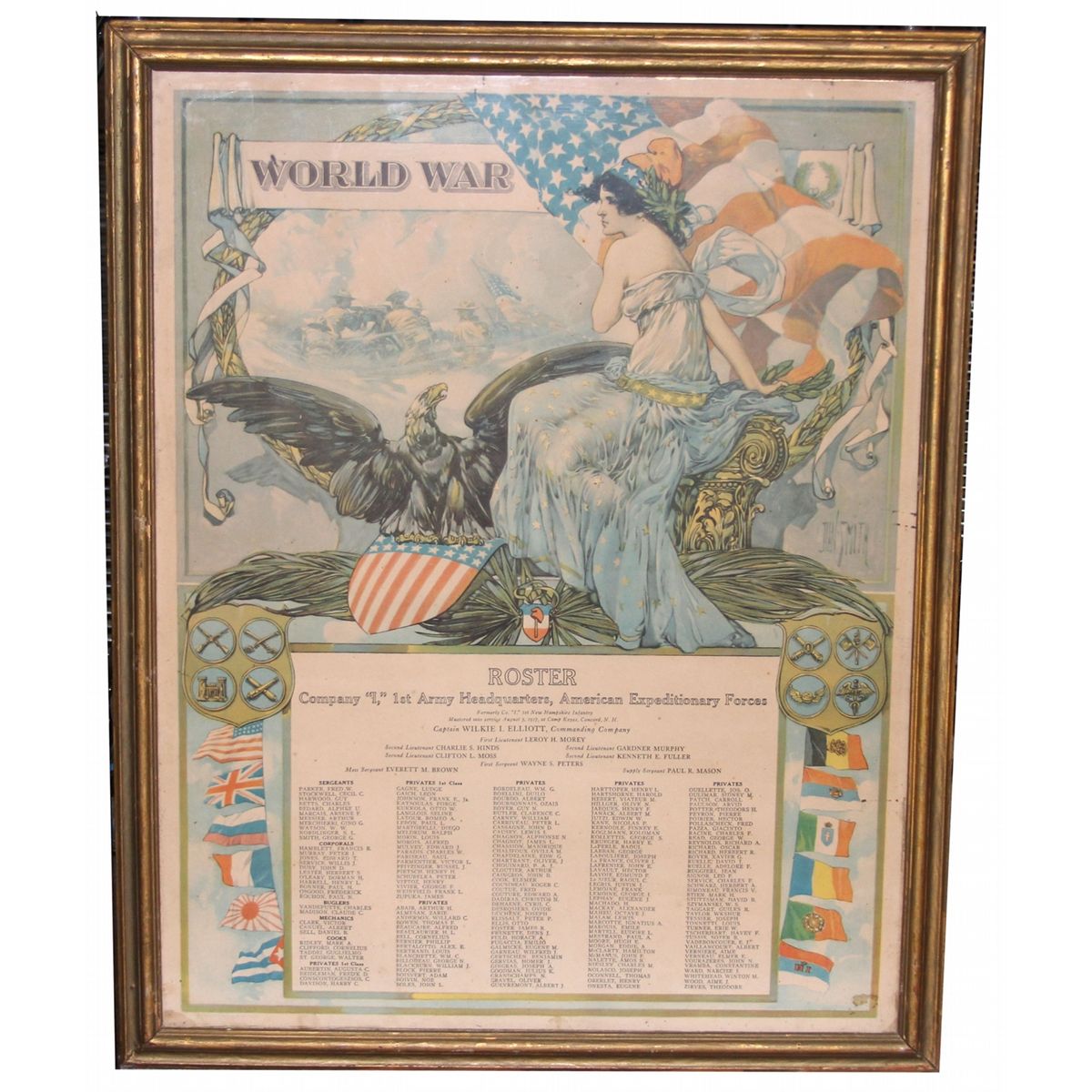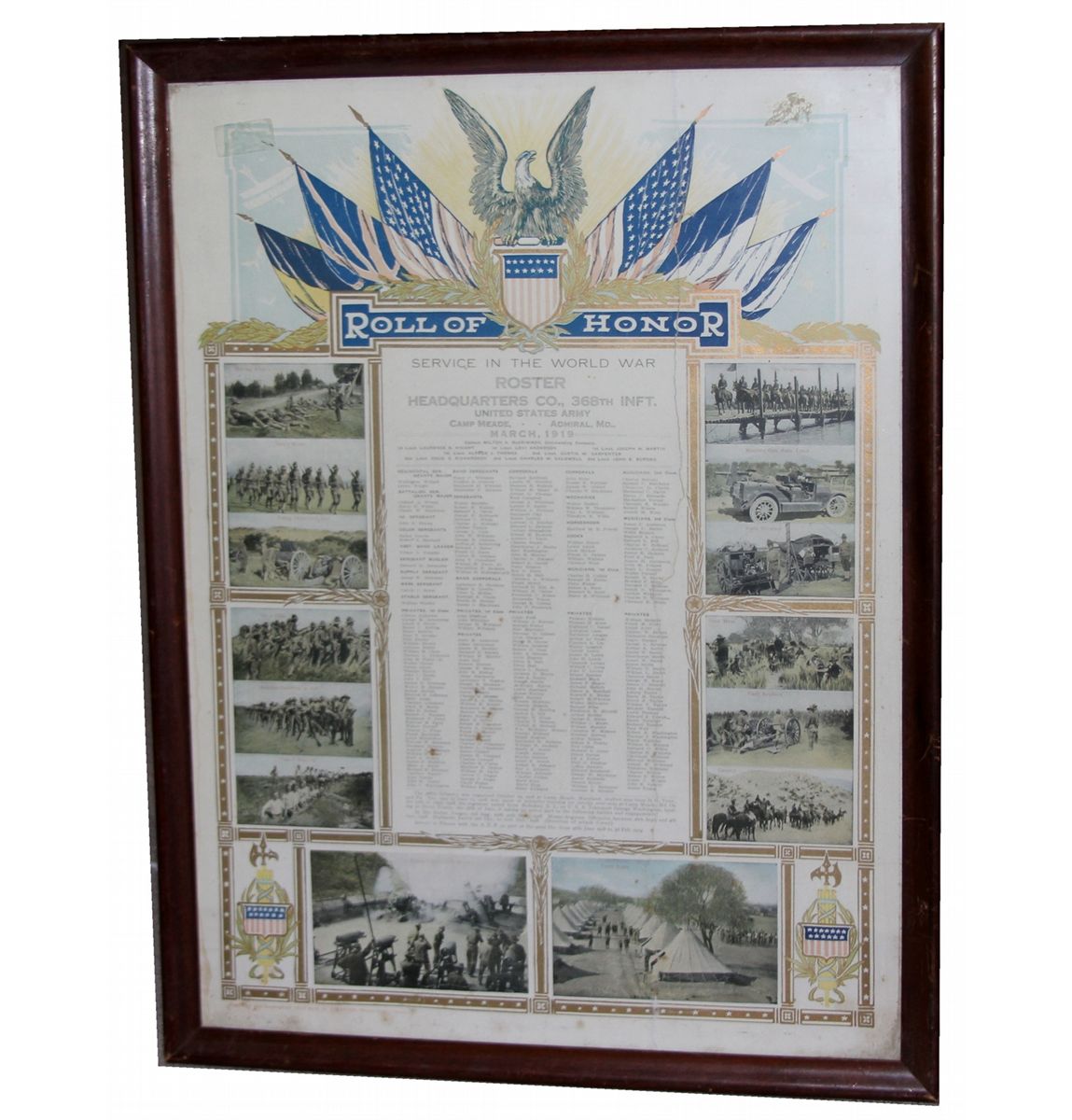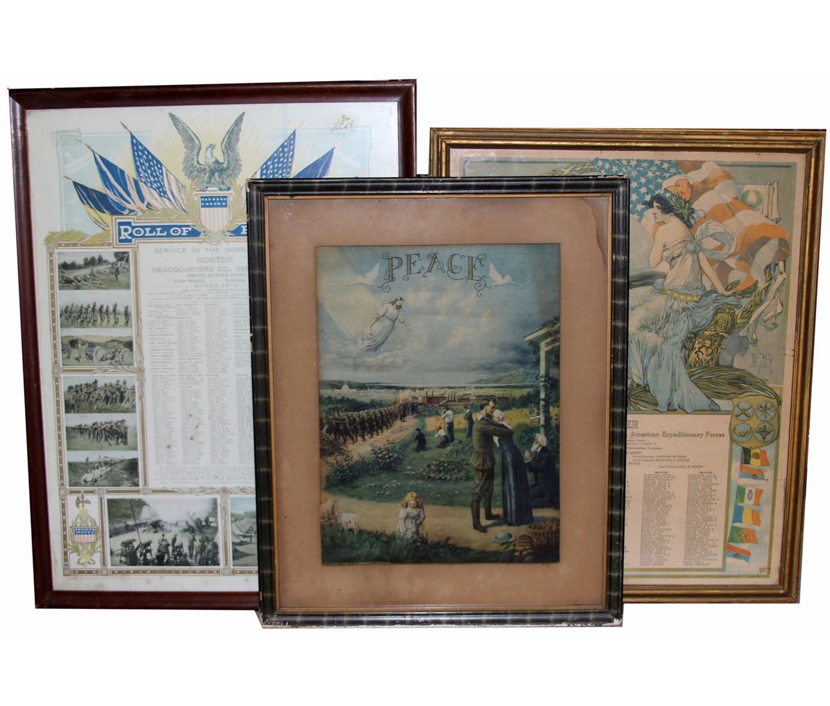 FRAMED WWI POSTER LOT OF 3 20x25.5" Roster, 19x23" Roster, 17.5x21.5" Peace poster. Country: US Condition: Very good.