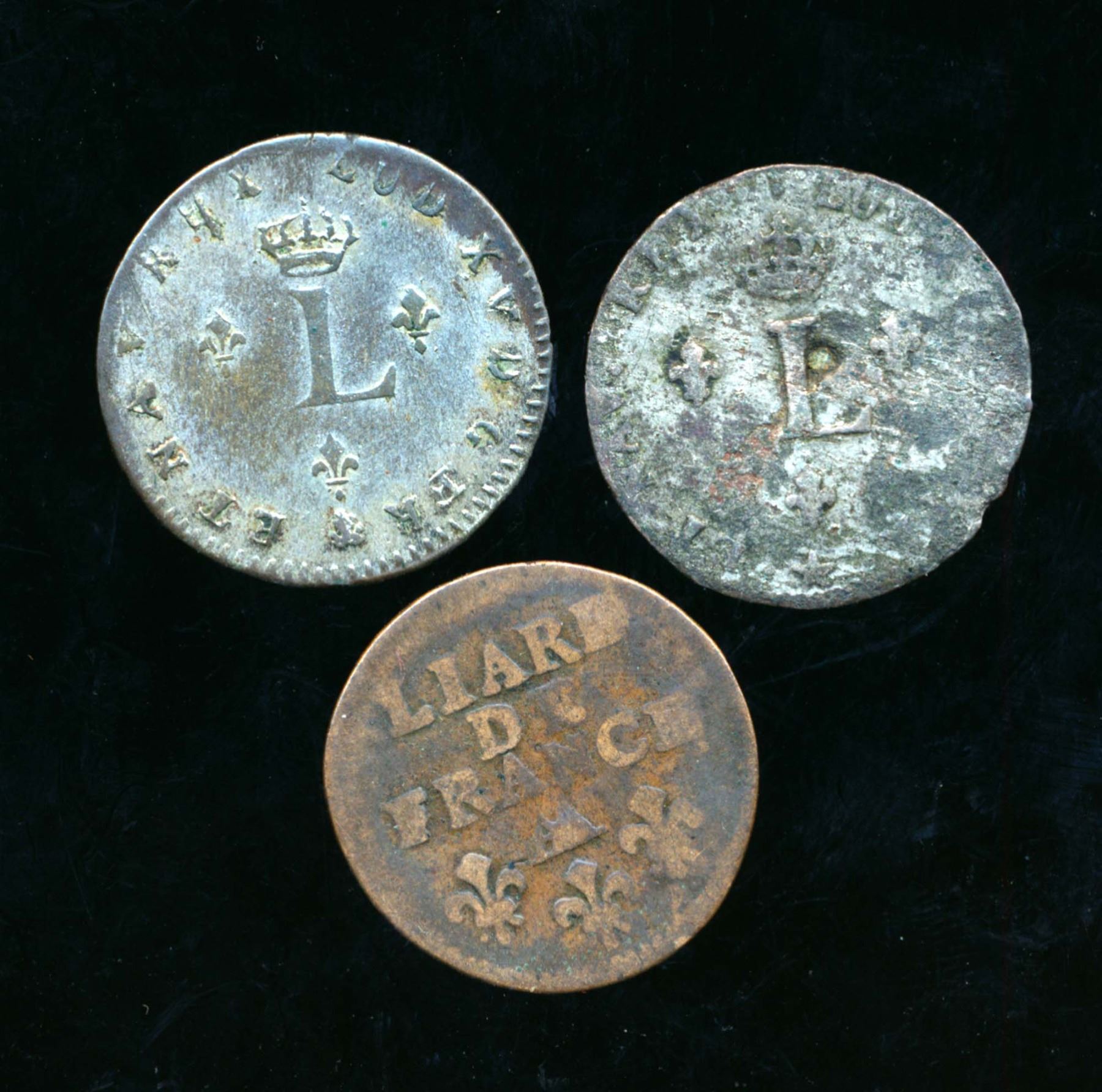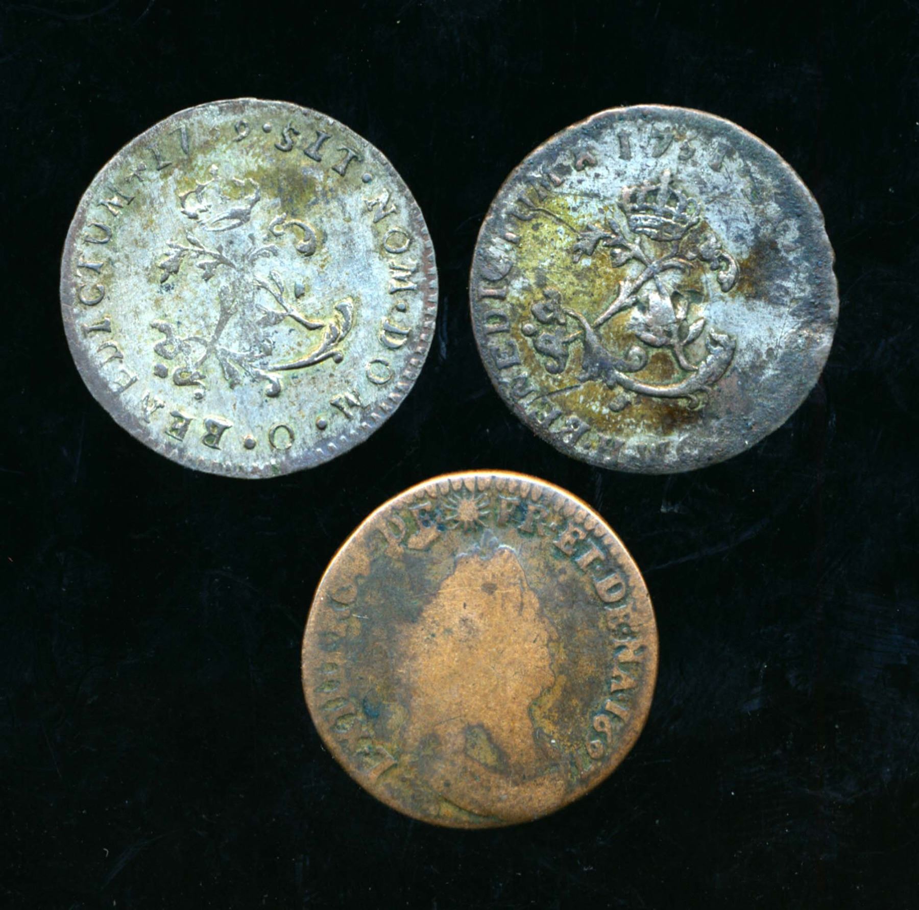 Drouliers # 709 1697 AA Liard du France 3.0 grams and 2 x Drouliers #785 Two Sols aux 2 L's Crowned 1739 O 2.2 grams and 1751 H 2.0 grams