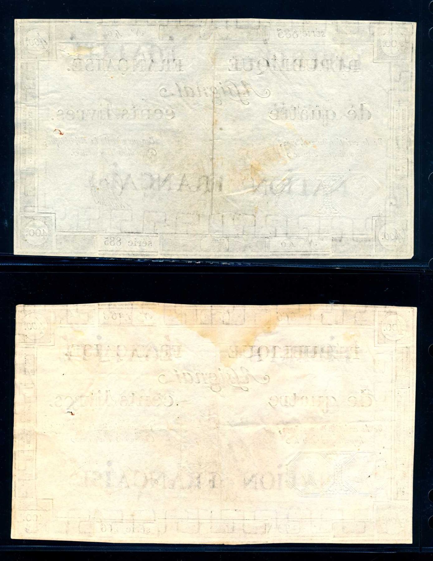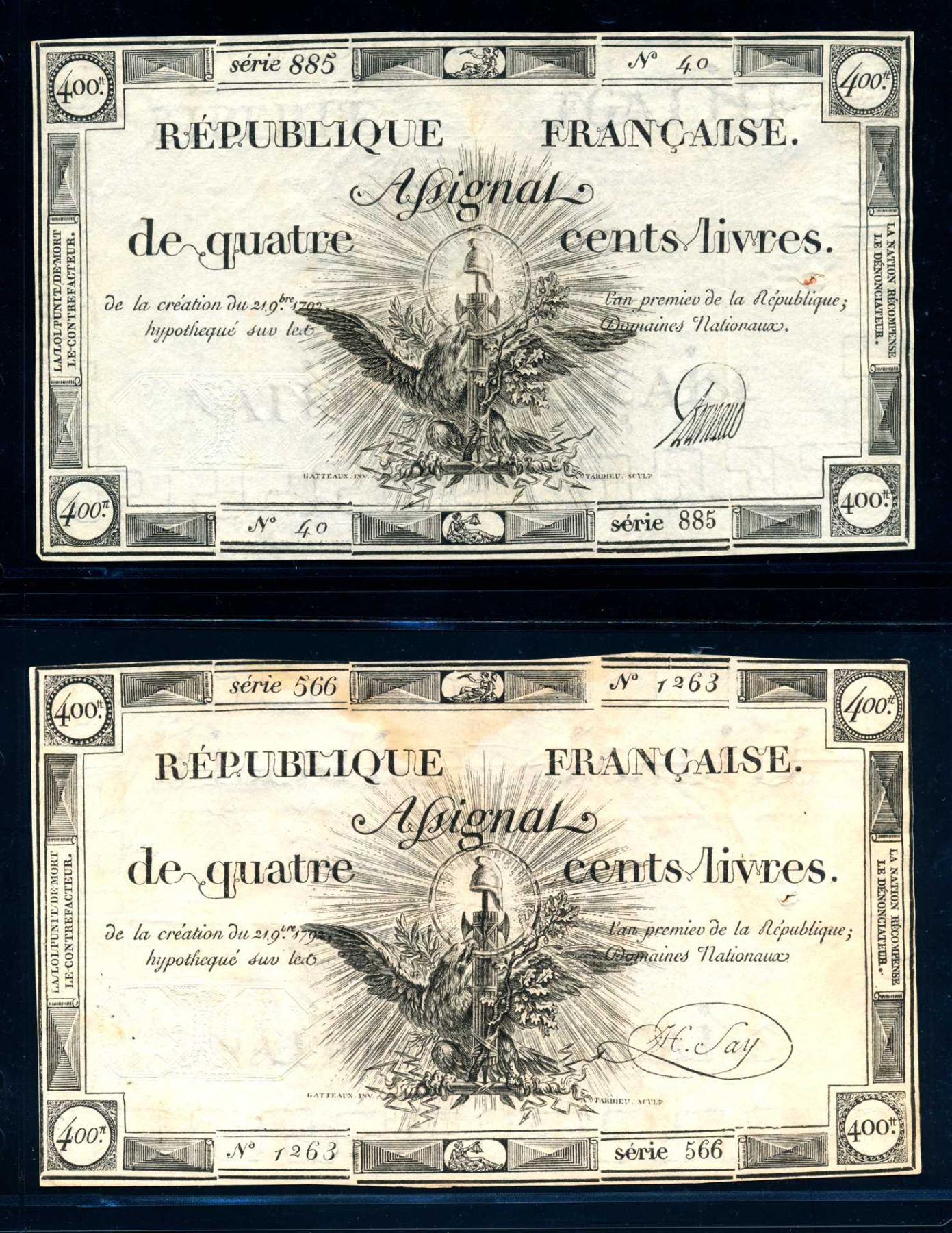 2 x 400 Livres P-A75 (186 x 112 multiple folds, several pin holes and post hole, signature by Say, series 566 #1263 (187 x 112 mm. multiple folds and post hole, signature by Darnauld, series 885 #40).