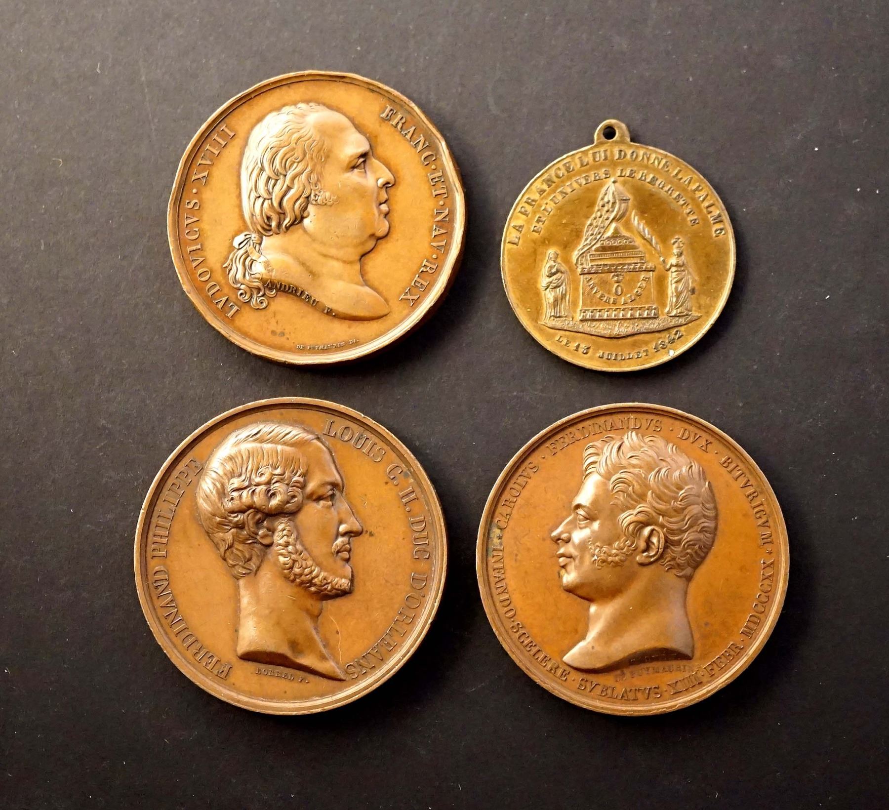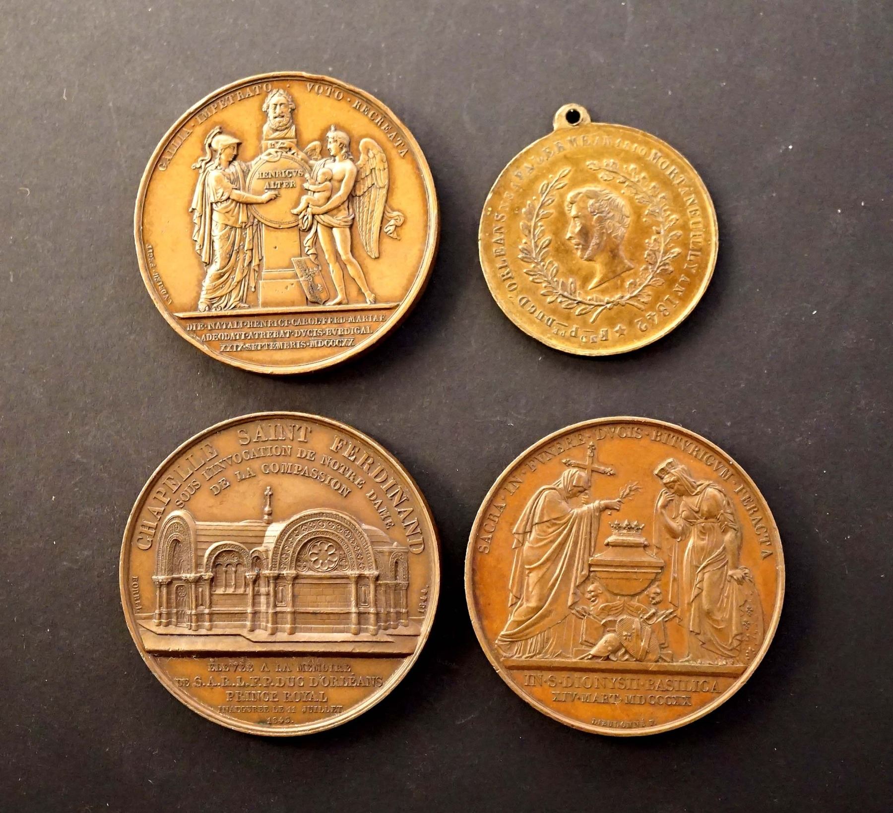 1820 Birth of Henry By Andrieu AE-51.5 71.3 VF, 1820 Duc Du Berry by Puymarin AE-50.5 62.1 gms. Edge: Plain EF, 1842 Death Medal w/loop July 13, 1842 AE-39 17.3 gms. Edge: Plain VF. and 1845 Ferdinand Philippe by Borrel AE-52 76.2 gms. Edge: Plain, Chapelle Saint Ferdinand by Borrel 1844. comes with original ticket from Coen-Messer Co. EF.