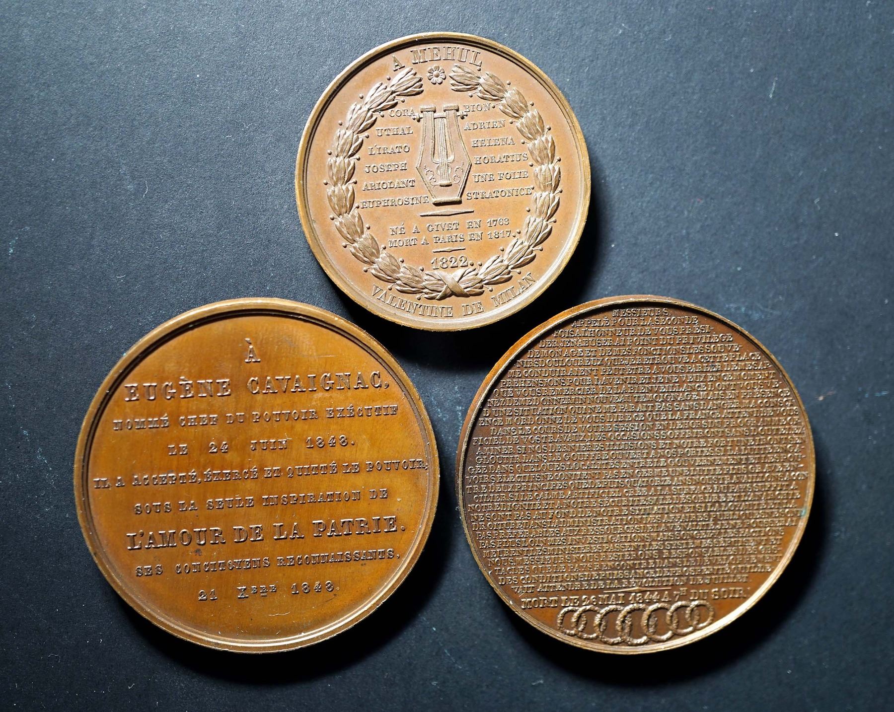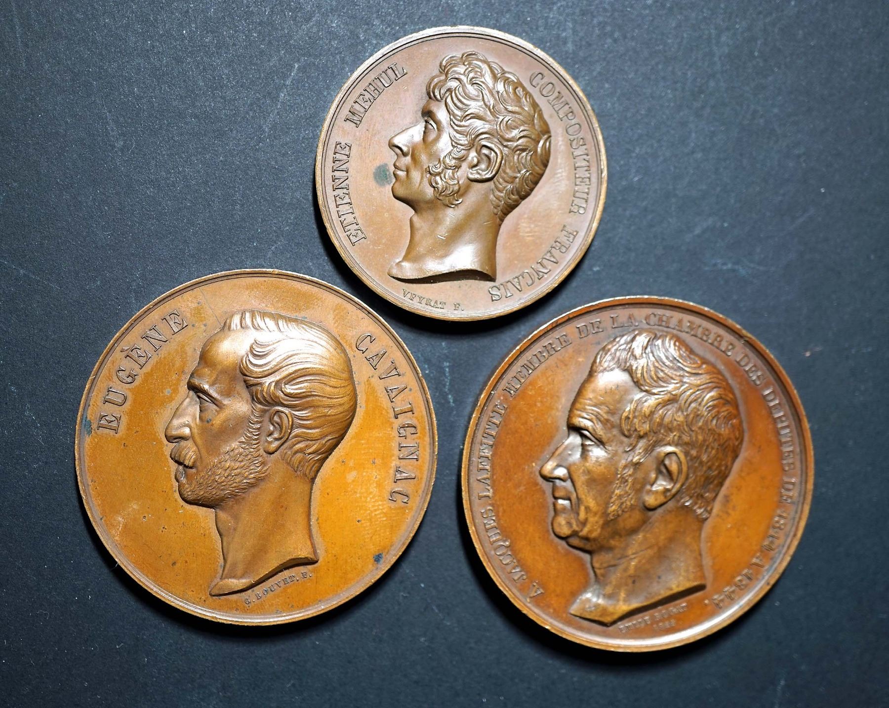 1822 Etienne Mehul "Valentine du Milan" by Veyret AE-41 36.9 gms. Edge: Plain EF, 1848 Eugene Cavignac "L'amour de la Patrie by Bouvet AE-50 61.6 gms. Edge: Pointing finger w/cuivre EF+ and 1844 Jacques Laffitte Parlimentarian AE-51 73.8 gms. Edge: Prow of a boat w/cuivre.
