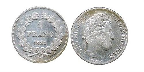 FRANCE; 1834 Silver franc of Louis Philippe struck at Rouen. EF