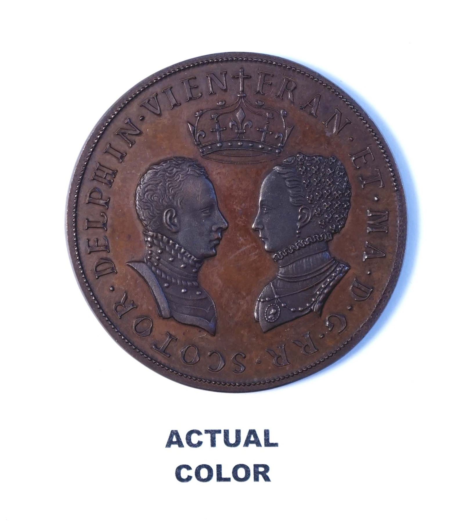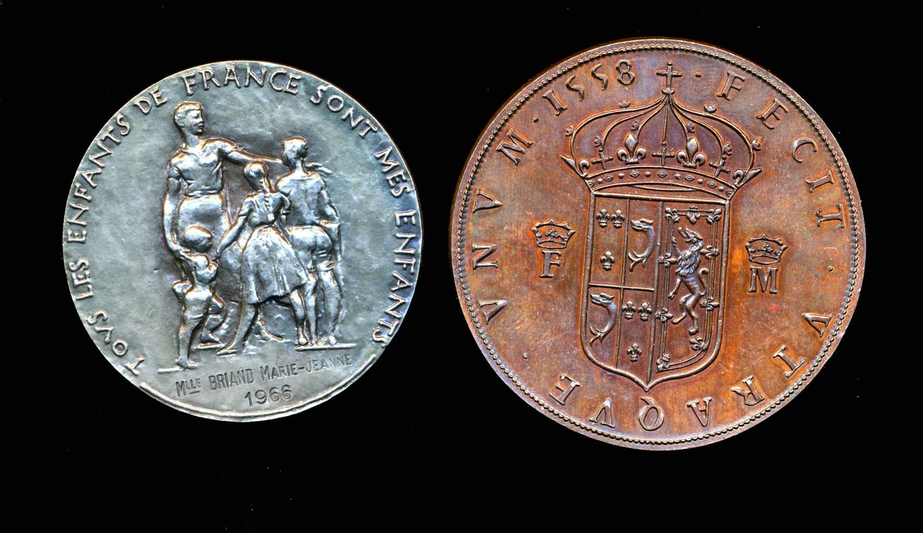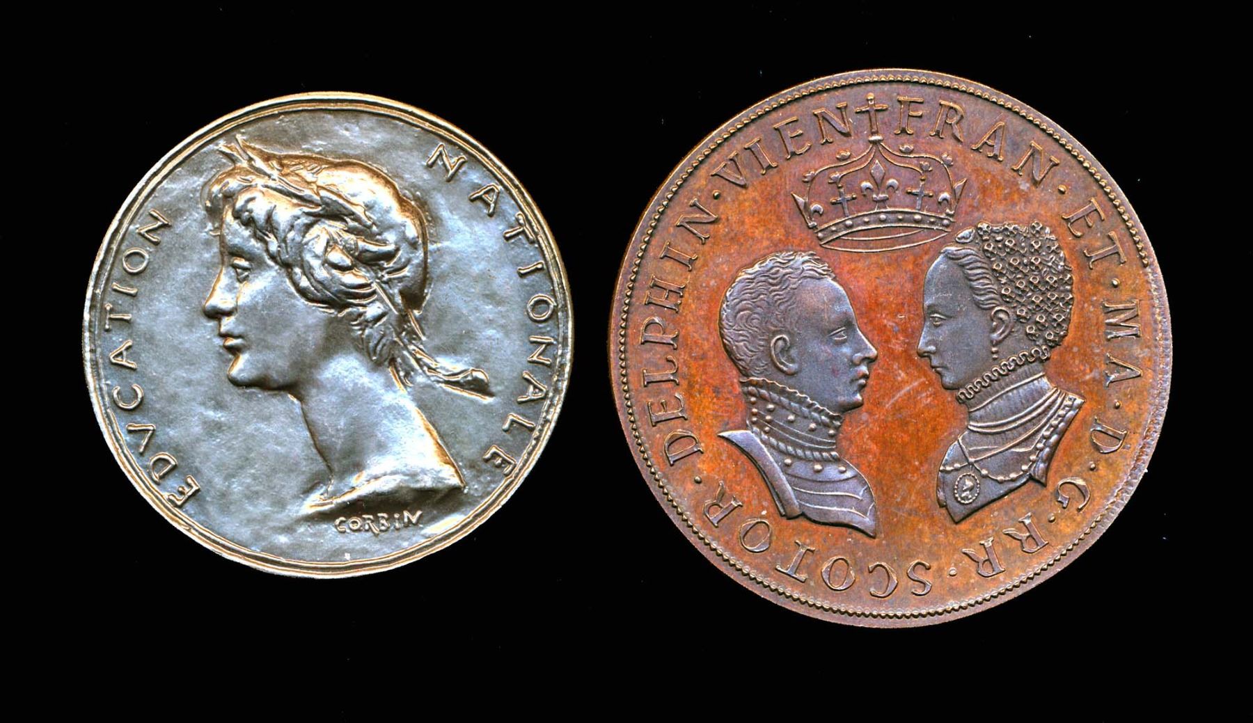 Marriage of Mary, Queen of Scots & Francis II Eimer 40 AE-51 53.2 gms. edge:pointing hand 1845-1860 and Corbin Educational medal AR-45 41.7 gms named: Miss Marie-Jeanne Briand 1966 edge: cornicopia w/1argent .