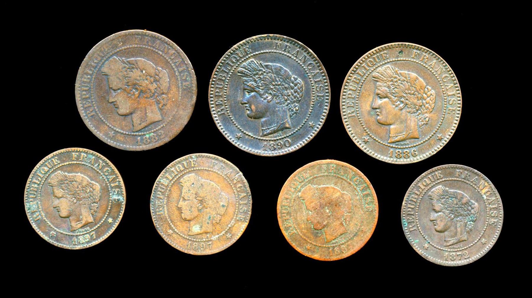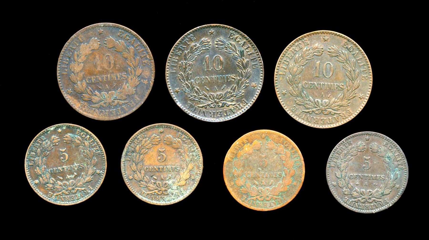 3 x KM# 815.1 10 Centimes 1882 A VG, 1886 A EF, 1890 A Unc with 4 x KM# 821.1 1872 A VF, 1884 A VG, 2 x 1897 A VG & VF.