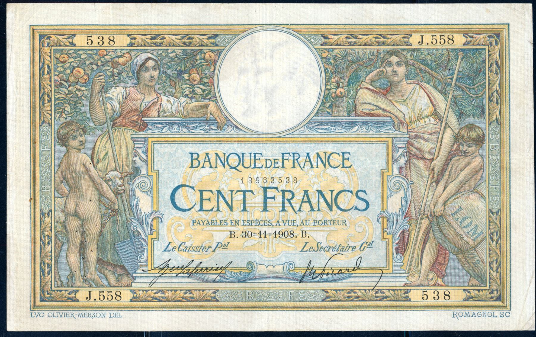 FRANCE 1908 Hundred Francs Banknote Extra Fine