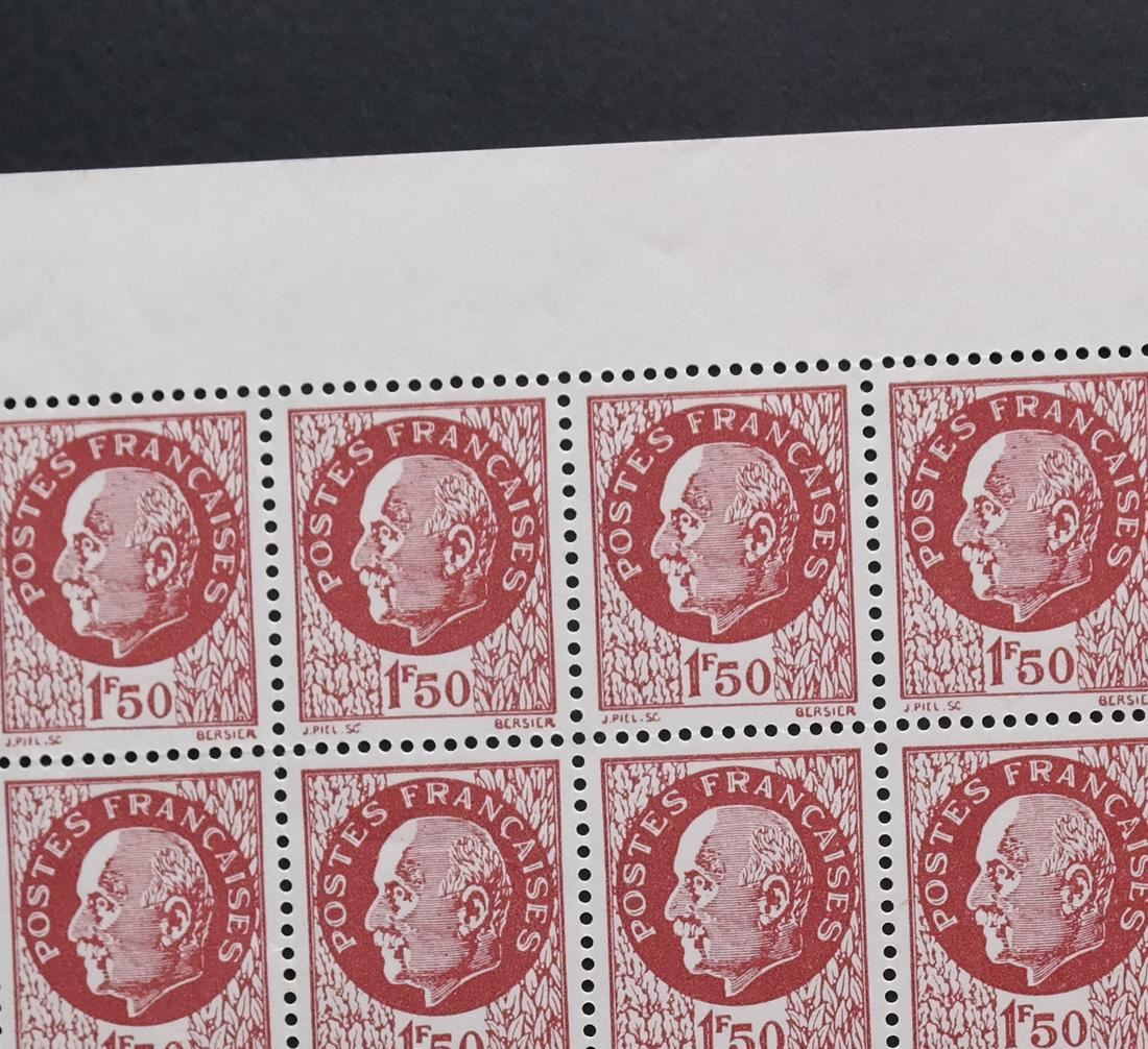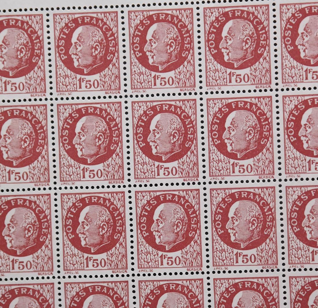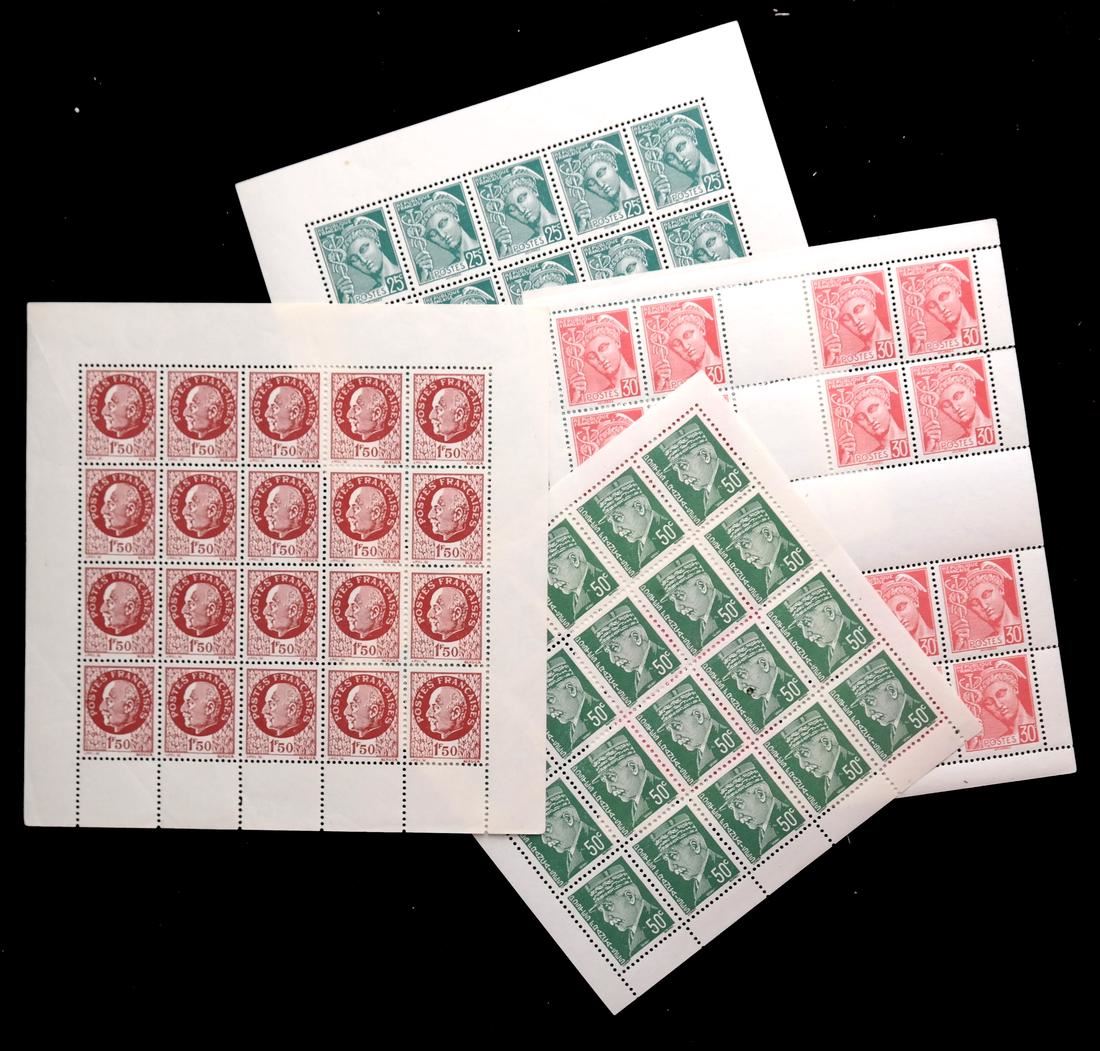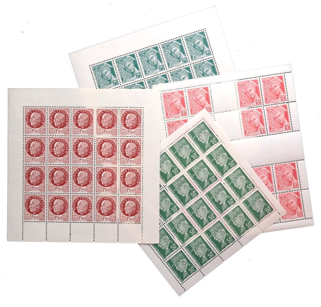 Produced by the British intelligence services for use in German-occupied France, includes full sheets of 25c and 30c Mercury and 50c and 1Fr50c Marshall Petain propaganda forgeries (Maury #1, 2, 5 and 10) with NH original gum, scarce sheet in VF condition. Maury 1692+ (approx US$1,800)