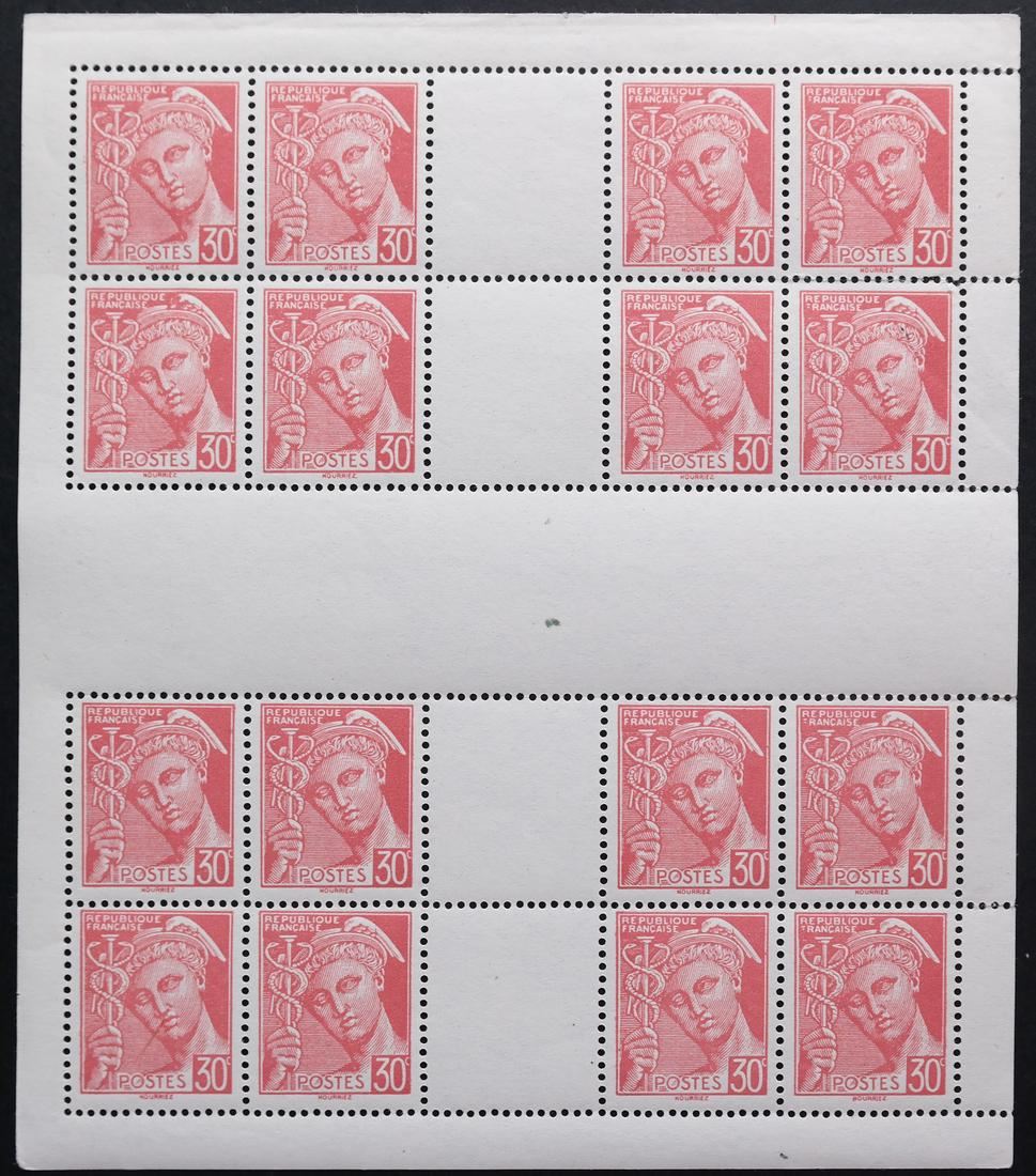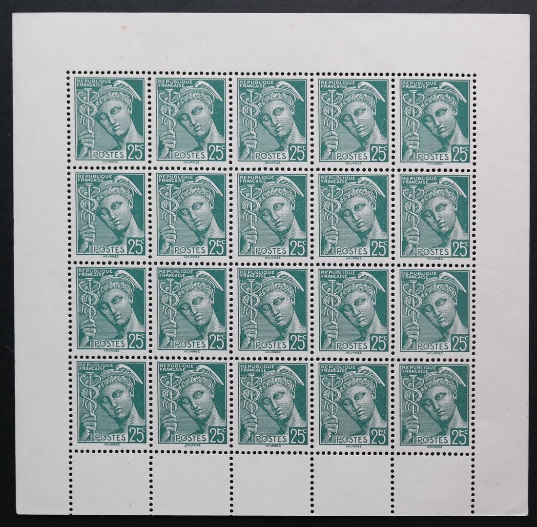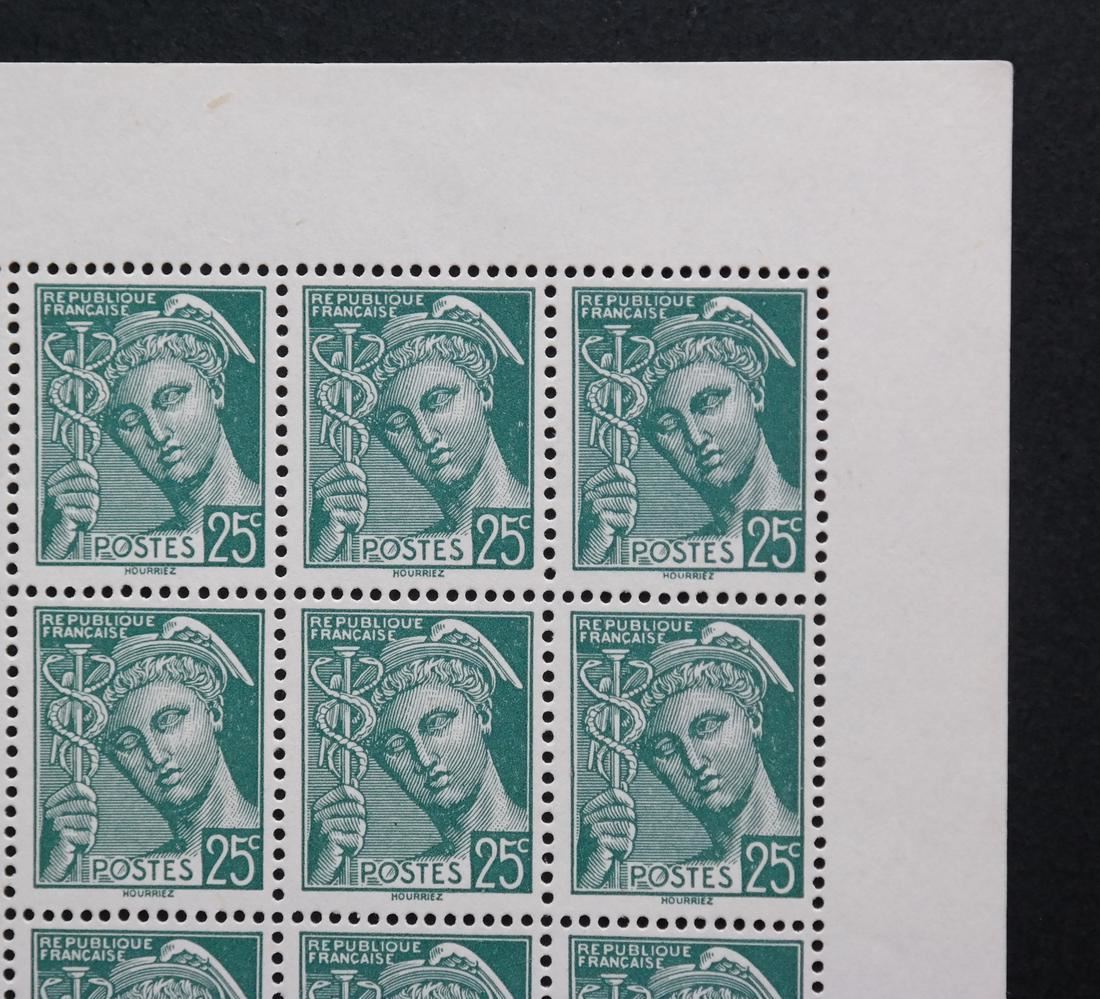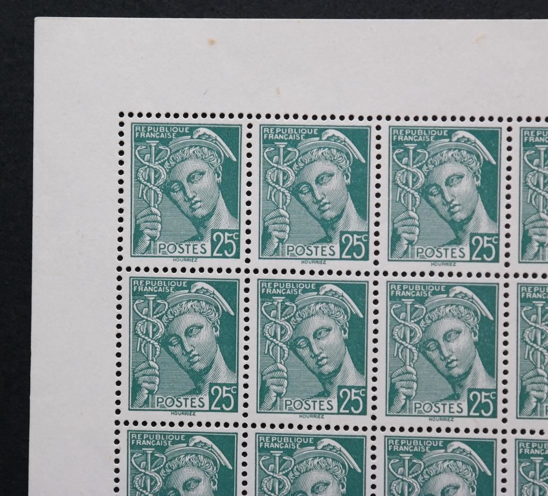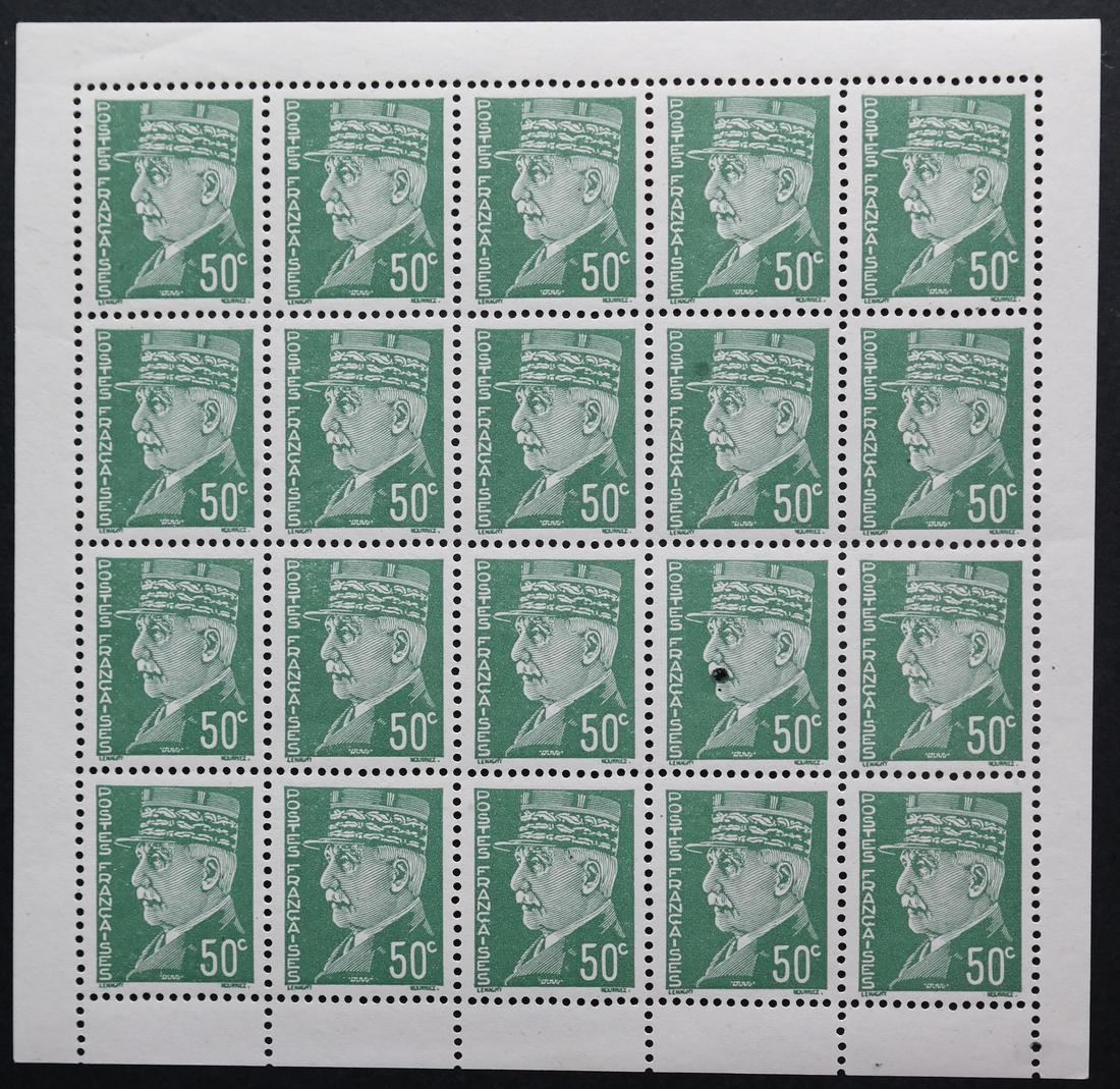 Produced by the British intelligence services for use in German-occupied France, includes full sheets of 25c and 30c Mercury and 50c and 1Fr50c Marshall Petain propaganda forgeries (Maury #1, 2, 5 and 10) with NH original gum, scarce sheet in VF condition. Maury 1692+ (approx US$1,800)