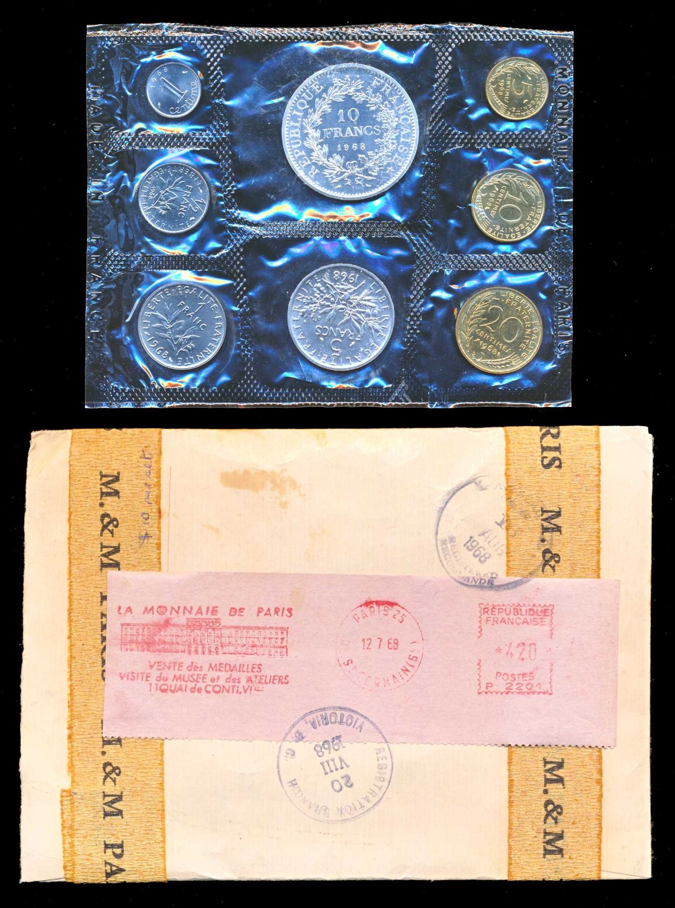 A 1968 FDC coin set with COA, packaged in an envelope sent by registered mail to Canada. Mailed July 12, 1968, it has a French registation sticker R4691 Paris 25 cancelled with a red M.N. stamp and the word "RECOMMANDE", a Canadian registered stamp of Aug, 16, 1968 in Montreal and a second registered stamp Aug.20, 1968 in Victoria, B.C. The enveope also has a cancelled French postal sticker and 2 strips of tape to seal the envelope. The odds of finding another shipping wrapper like this, is slim to none.RRRR
