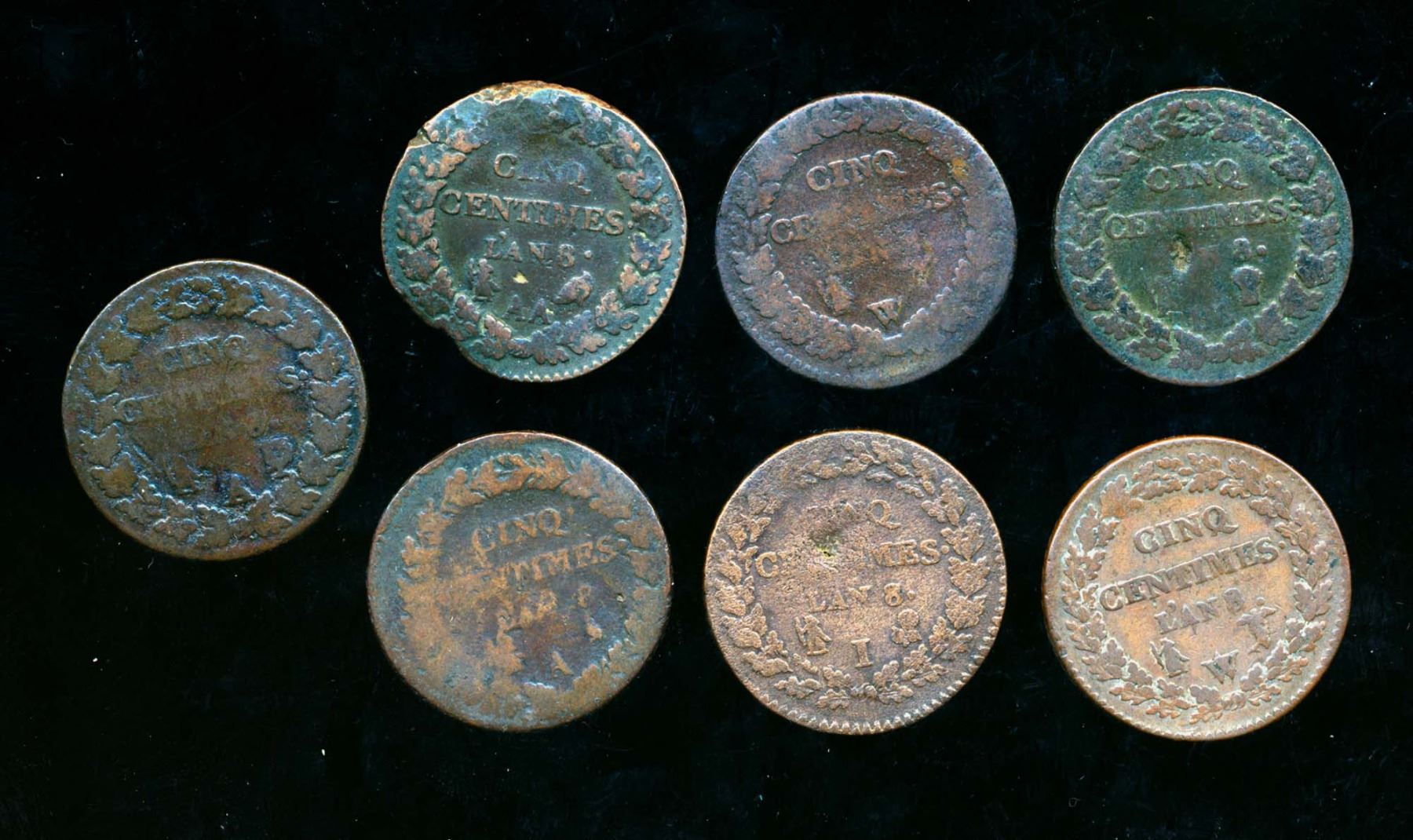 FRANCE 5 Centimes L'an 8 KM #640 A lot of 7 pieces in VG-Fine+