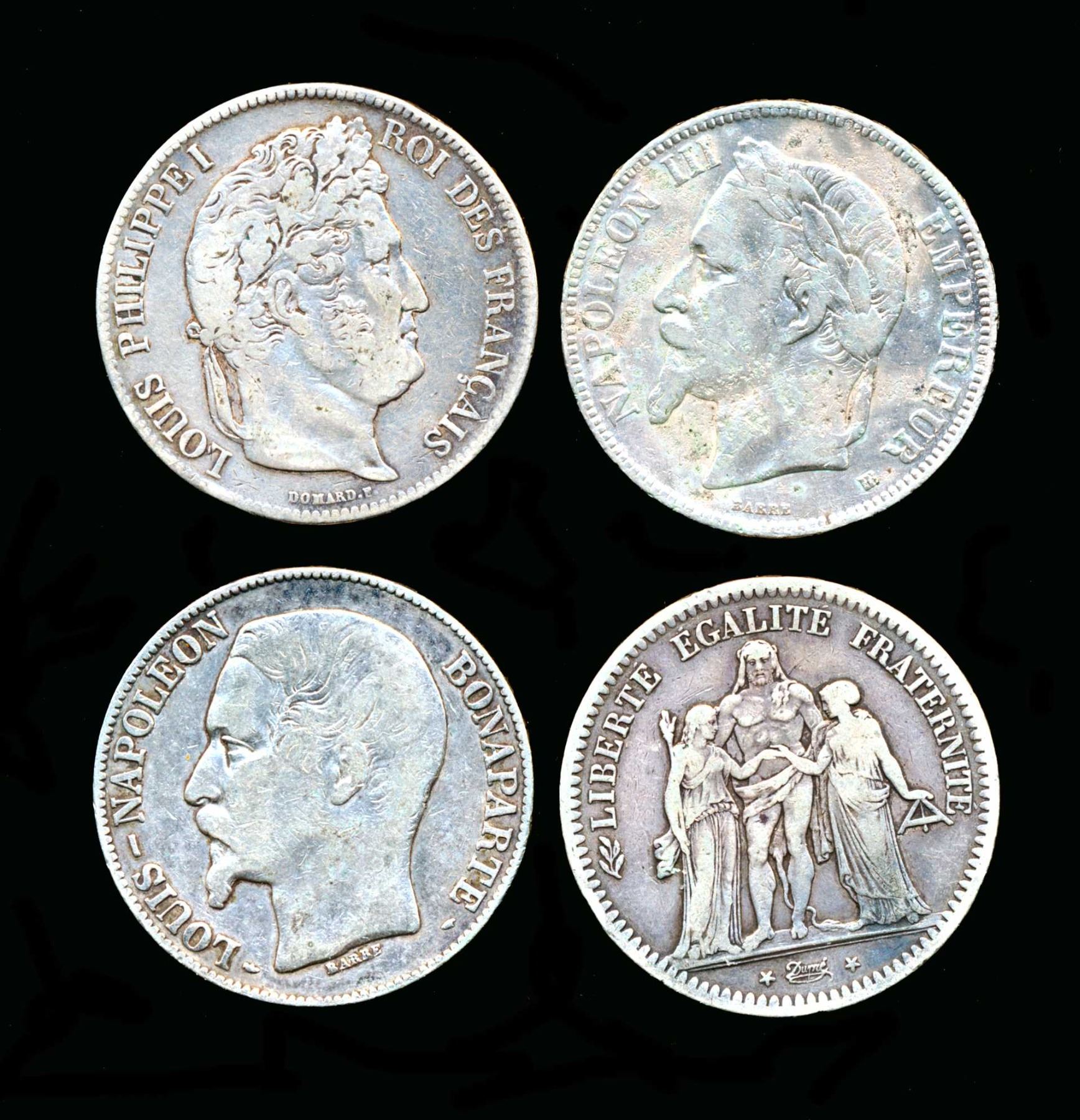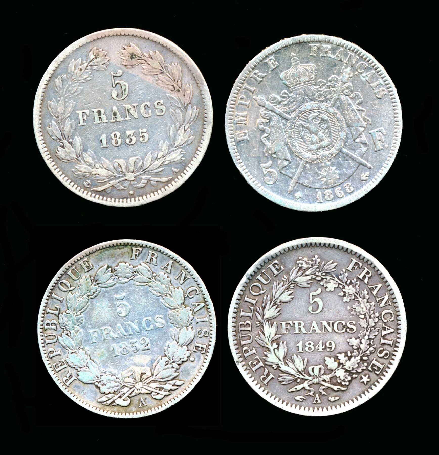 .900 AG 2.89 tr.oz. 1835 A Louis Philippe I KM# 749.1 F, 1849 A Hercules KM# 756.1 F, 1852 A Louis-Napolen KM# 773.1 F, 1868 A Napoleon III KM# 799.2 F.