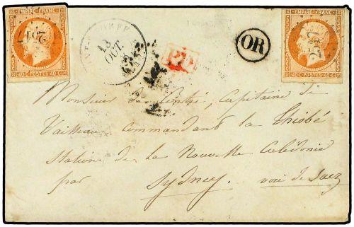 1858 Cover addressed to the Captain of the ship THISBE stationed at NEW CALEDONIA, and sent to that destination via Sydney, Australia. Cover franked with two Napoleon 40 c. orange (Ceres 16), tied by ´2517´ Petite Chiffre lozenge, with PONT-SCORFF cds and circle ´OR´ (Origin Rurale) handstamp alongside. Front shows red boxed ´PD´, and reverse bears SYDNEY/SHIP LETTER transit. A beautiful cover to an extremely rare destination.