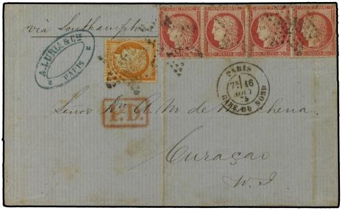 1875 (Aug 16) Cover at quadruple rate from Paris to Curacao franked by 1870 Siège 40c. orange and strip of four 1871 80c. carmine tied by Paris Star/26 in black. Two vertical file folds but an exceptional and attractive franking to a very scarce destination. Ceres 38,57.