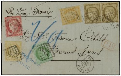 38,53,56,57,59 1872 (Dec 14) Cover from MARSEILLE to BUENOS AIRES with double rate of 2 francs paid by extraordinary franking of 1870-71 5 c., 15 c., 40 c., 30 c. pair and 80 c. all tied by "2240" gros chiffres; carried by SGTM PACKET FRANCE. Pretty five colour franking.