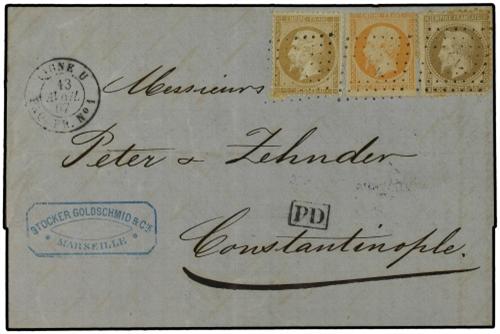 1867 (April 13) Cover from Marseille to Constantinople with mixed issue franking of 1862 10c. bistre brown, 40c. orange and 1867 30c. brown tied by Anchor lozenges in black; fine strike of ´Ligne U/Paq.Fr.No.1´ at left in black and reverse with arrival (April 19). A few small imperfections but a rare franking. Ceres 21,23,30.