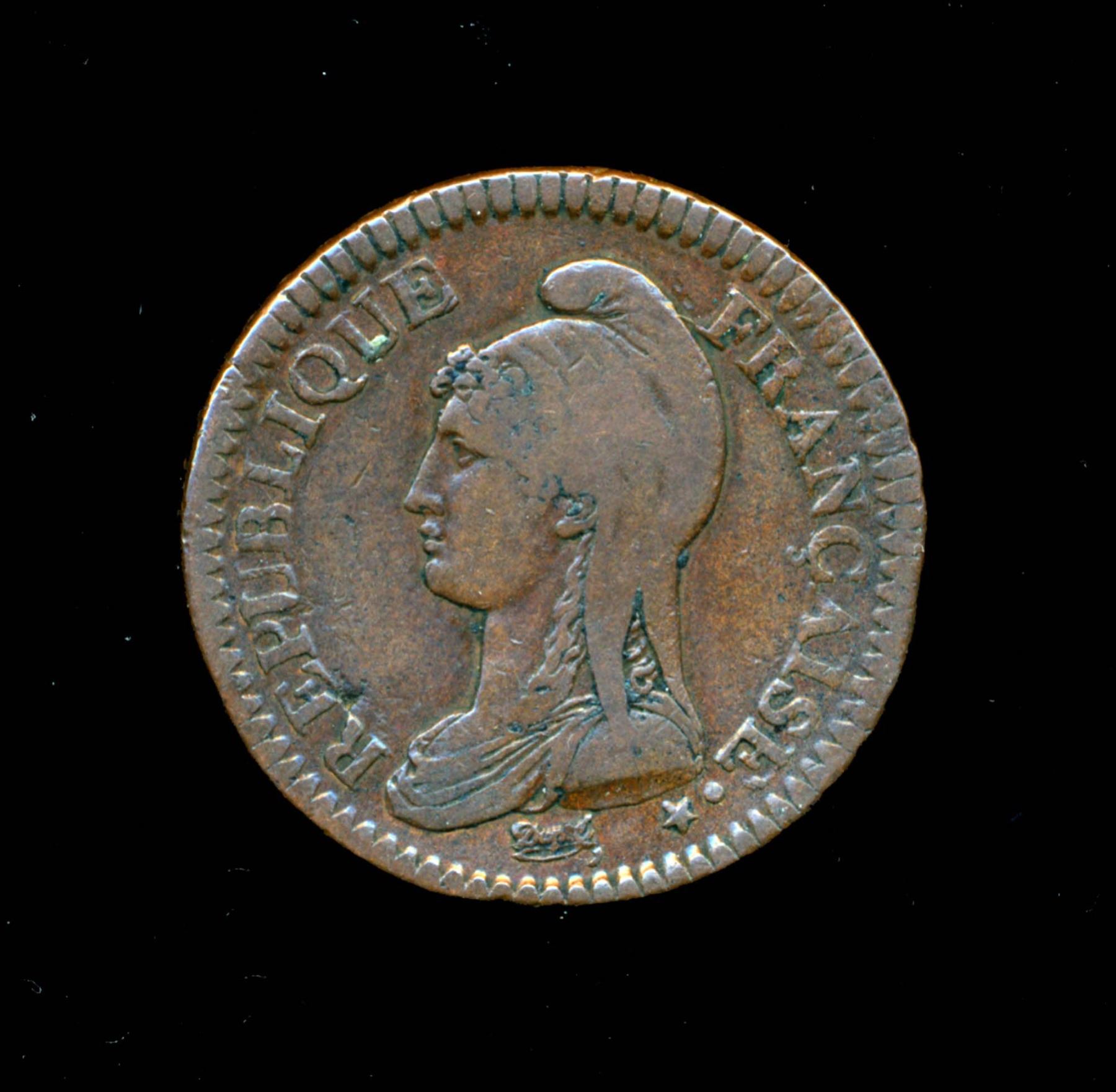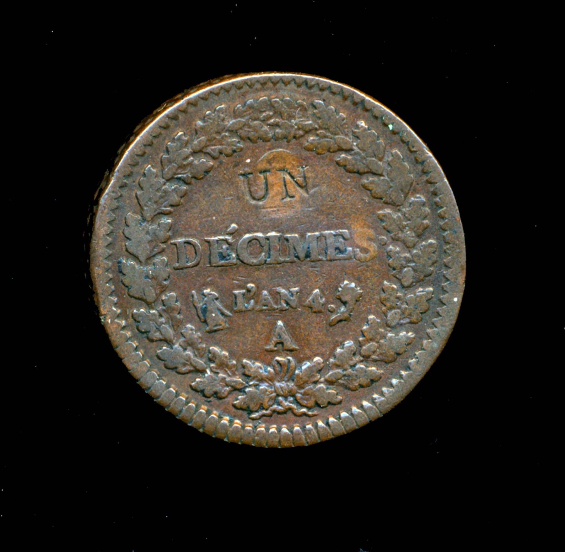 FRANCE Decime L'an 4 A KM #637.1 "UN" incused Fine Plus Edge: Diamonds