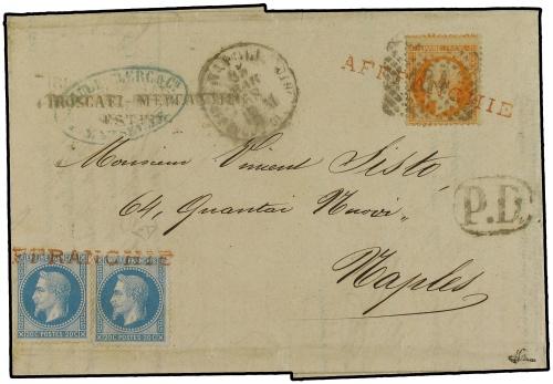 1868 (March 21) Entire letter from MARSEILLE to NAPLES carried on the "Ville de Marseille" carried at double rate and franked on departure with 1862 40 c. and two 1867 20 c. tied by rare strikes of AFFRANCHIE in red (to prevent against theft) and the 40 c. also tied on arrival by Naples "184" obliterator with cds at left (Salles 695,696). Two line PIROSCAFI - MERCANTILI / ESTERO alongside (Salles 692). RARE. Signed E. Diena and Brun.