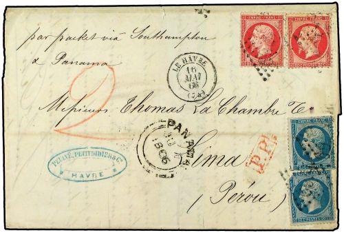 1866 [May 16] Entire letter to Lima, PERU via Southampton & Panama franked by 1862 2x20c blue, faults and 2x80c carmine rose tied by ´1769´ gros chiffres of Le Havre and carried at double rate. British PO Panama cds in black [June 7] on front and Lima arrival on reverse. Scott 26,28.