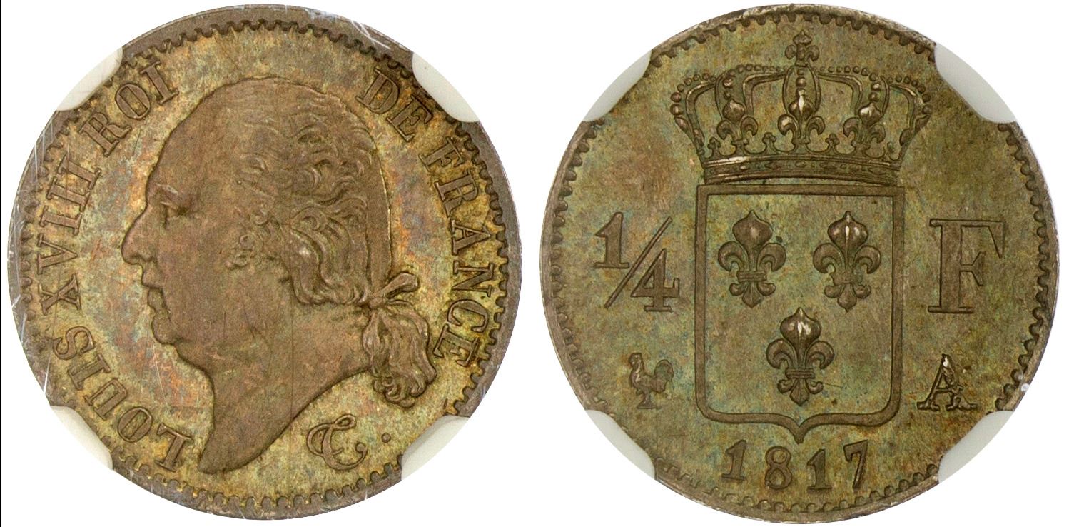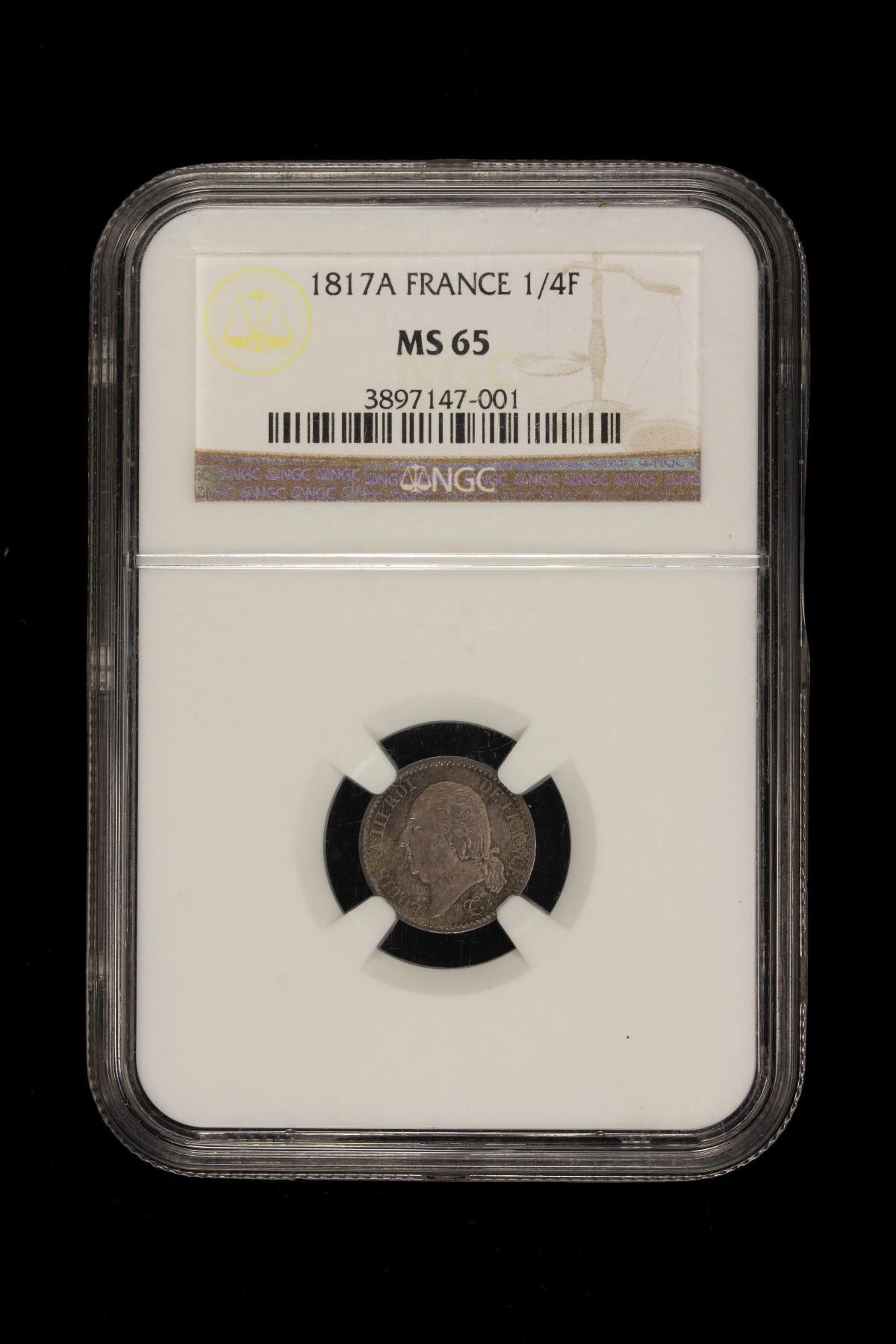 FRANCE: Louis XVIII, 1815-1824, AR 1/4 franc, 1817-A, NGC MS65