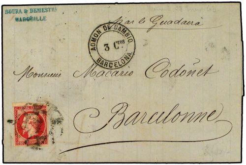 17 1863 MARSELLA a BARCELONA. 80 cts. rosa. Mat. RUEDA DE CARRETA 2 y marca circular ADMON. DE CAMBIO/3 CTOS./BARCELONA (Salles 613).