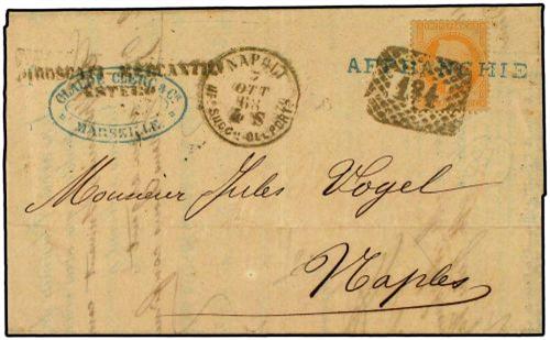 31 1868 MARSELLA a NAPOLES. 40 cts. naranja. Mat. lineal AFFRANCHIE en azul y PARRILLA DE PUNTOS 184 estampada en NAPOLES. En el frente PIROSCAFI-MERCANTILE/ESTERO (Salles 695).