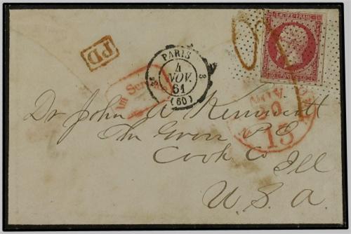 1861 (Nov 4) Mourning envelope from Paris to Cook Co., Illinois/USA franked by single 1853 80c. carmine tied by lozenge of dots ´pointille fin´ with framed ´Am. Service´ in red. Handstruck ´9´ credit marking in red-brown on the adhesive and ´New York/15´ transit in red (Nov 20). Ceres 17.