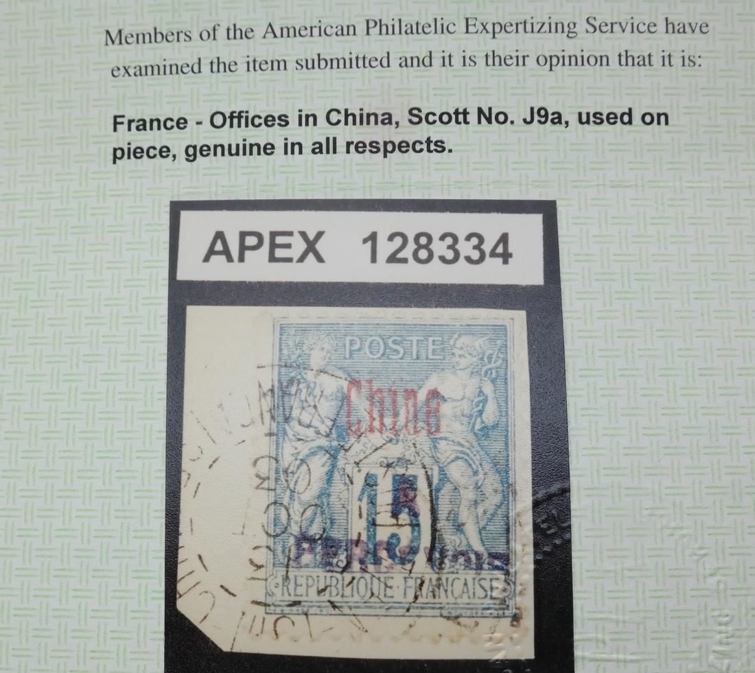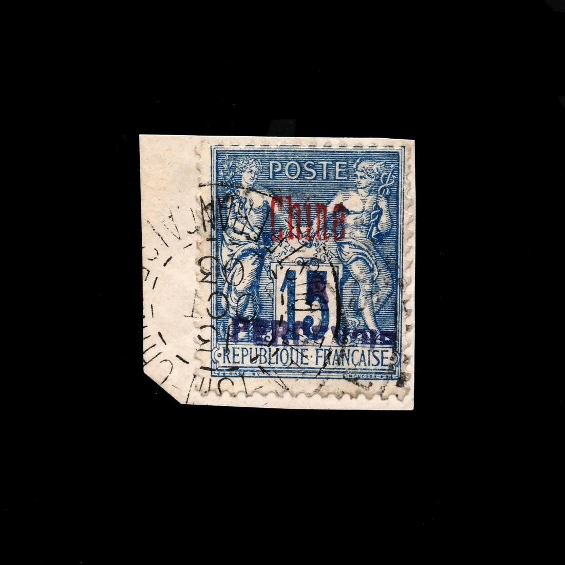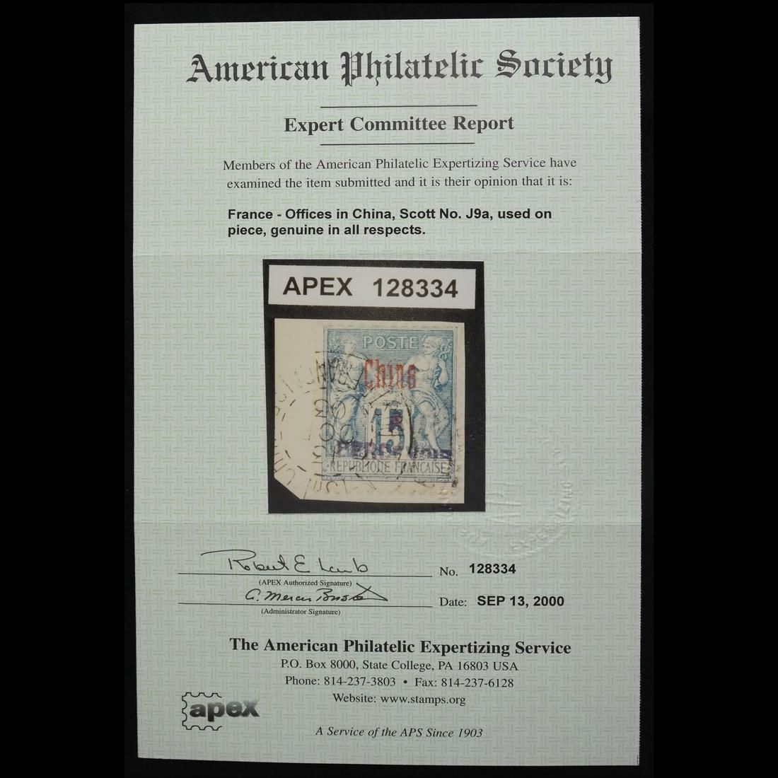 Purple A PERCEVOIR handstamp, Scott #J9a, Yvert #TT8a, tied on piece by 13 OCT 03 TIEN-TSIN CHINE POSTE FRANCAISE datestamp, 2000 APS certificate stating genuine in all respects, Scott unpriced, Yvert 1,050 (approx US$1,110)