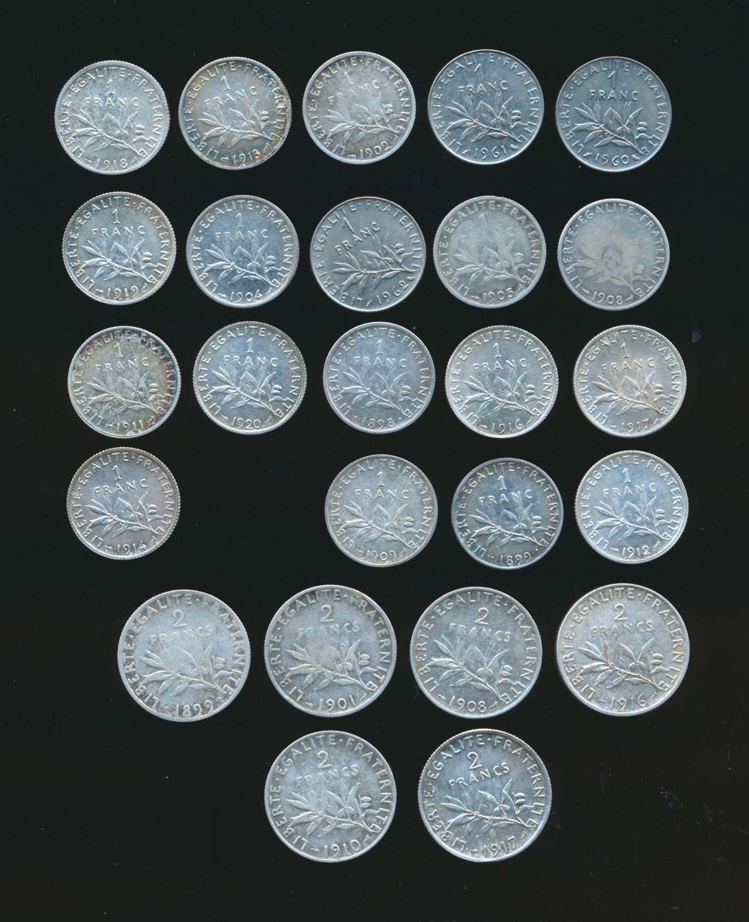 Un ensemble de départ de 25 pièces de 1 et 2 francs. 59.5 grammes d'argent .835. Souligné par un franc 1914.